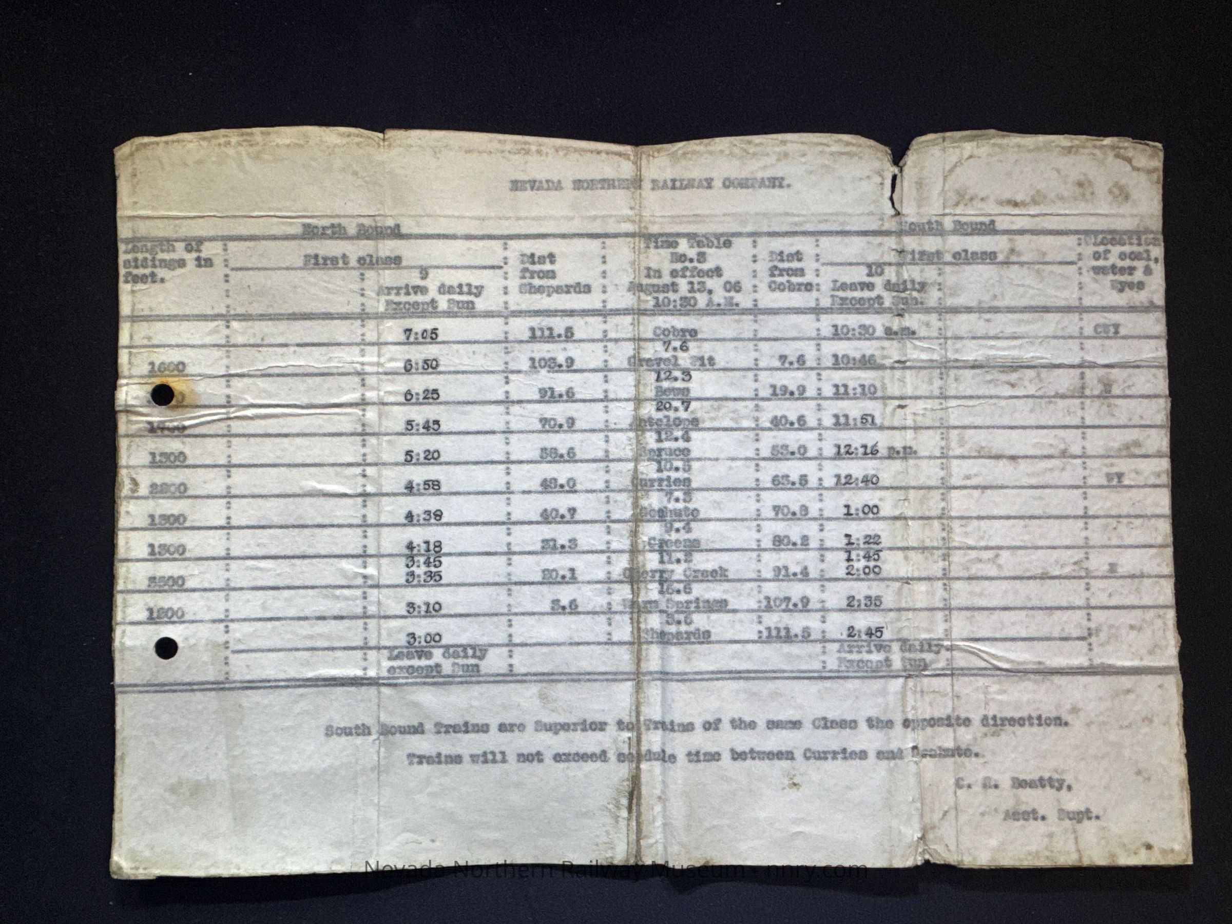 Nevada Northern Railway timetable no. 3, showing schedule between Cobre and Shepards, August 13, 1906