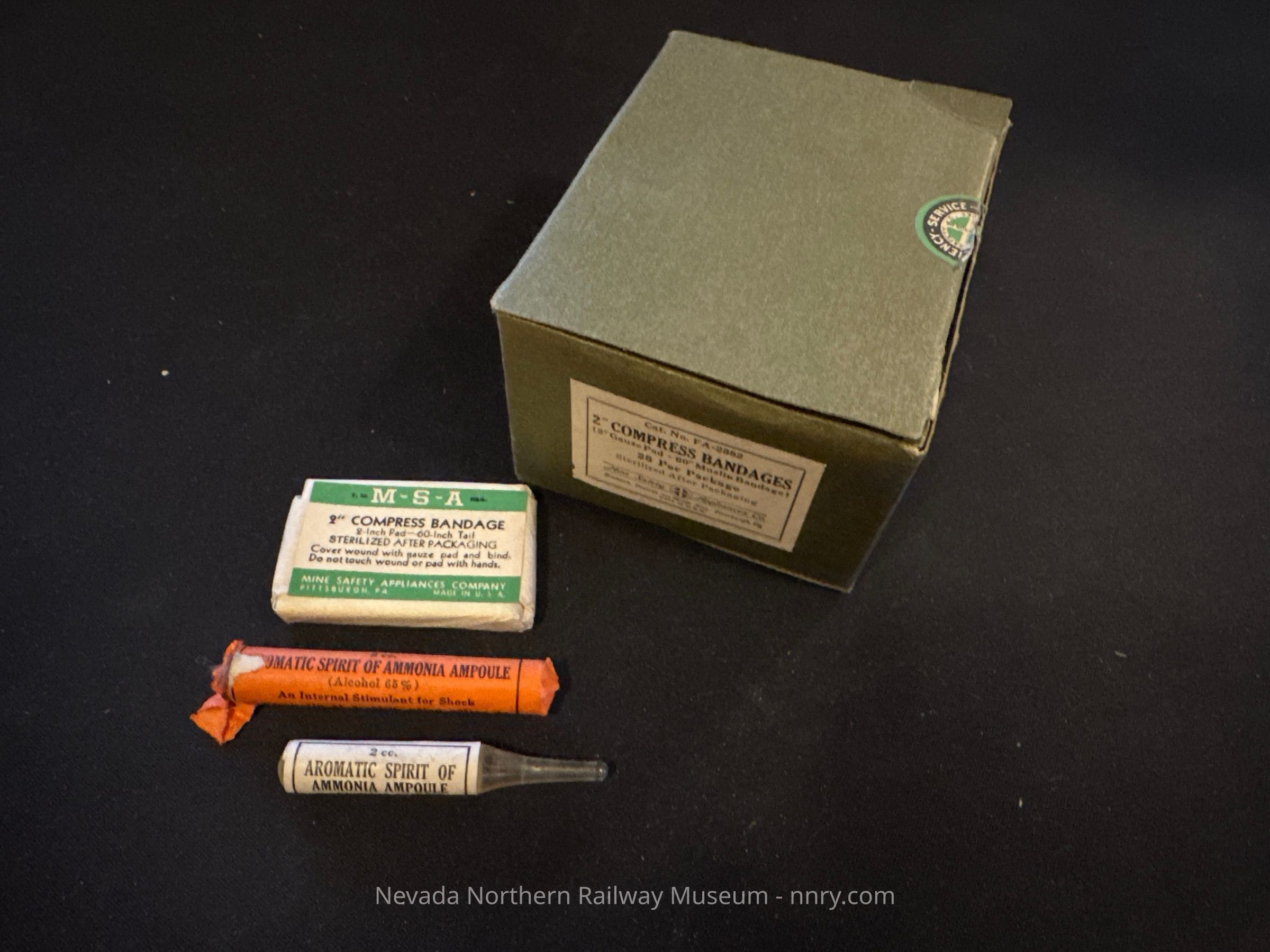 Box of 2 inch compress bandages, and two vials of Ammonia Ampoule.Category