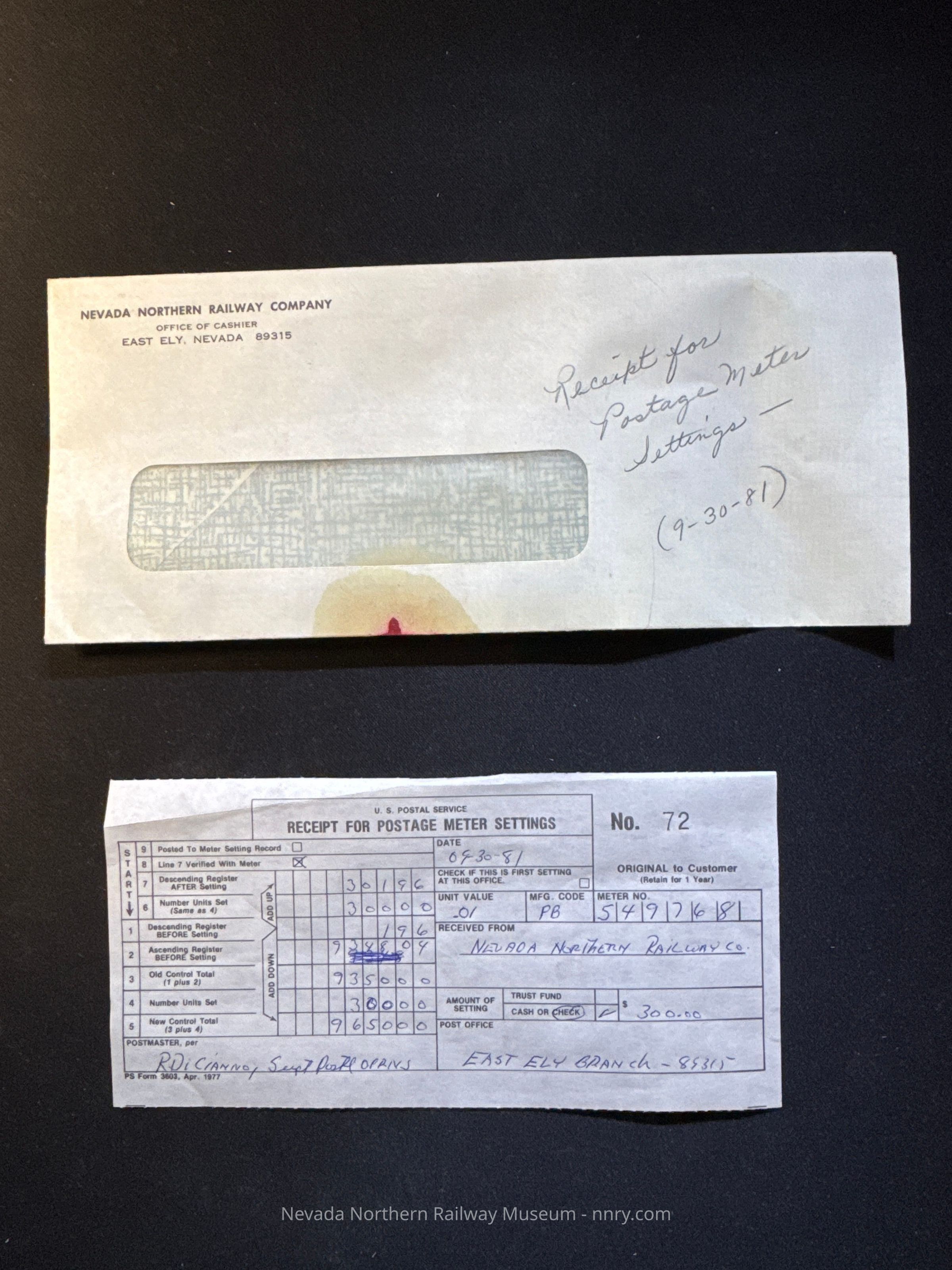 Receipt for postage meter settings in a NNRy Office of Cashier envelope, September 30, 1981