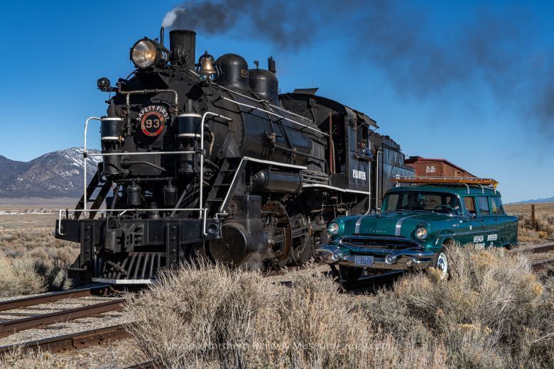 Locomotive #93 and Hi-Rail #18 at Hiline Junction, February 2024. Fireman Vince Whiteley in the cab window, Tony Liverani and Angie Stevens in #18.