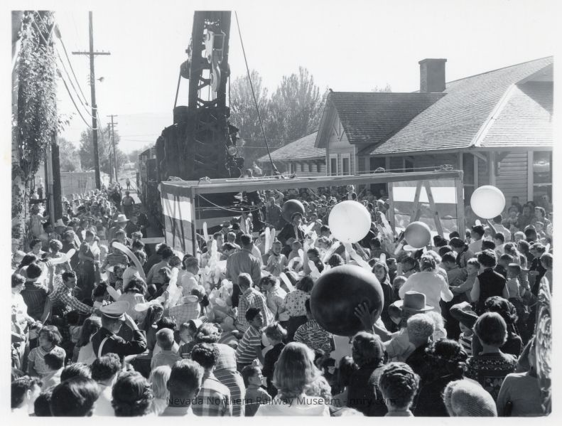 Wrecking Crane A used during the 50th Anniversary celebration at the Ely Depot moved by locomotive #401, September 1956.