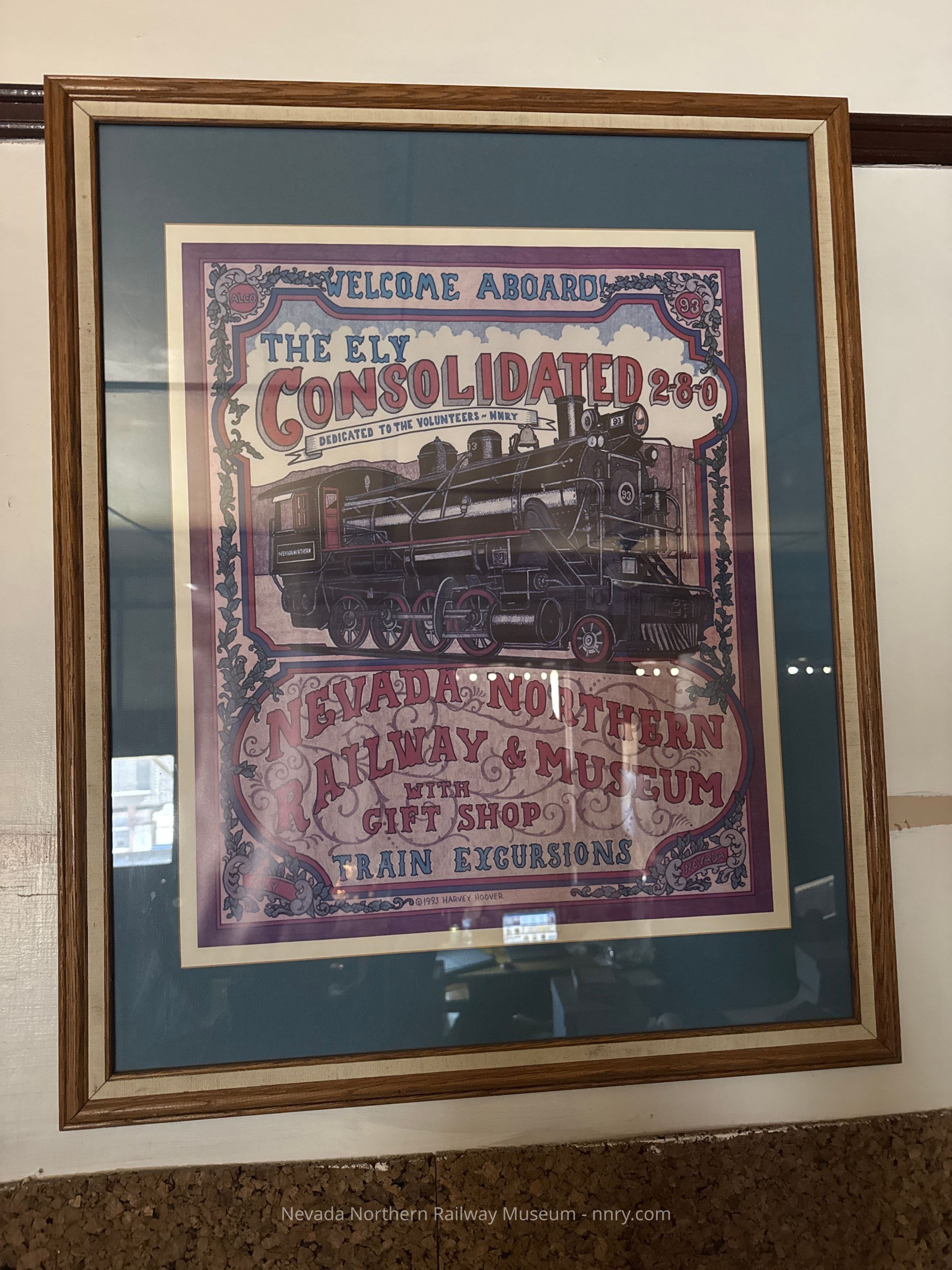 Artistic poster of locomotive #93 "The Ely Consolidated," in frame, Harvey Hoover, 1993.