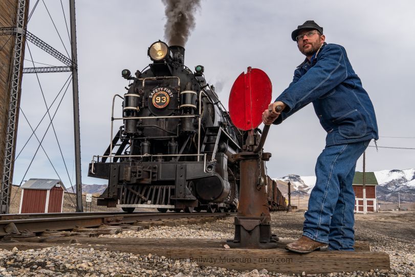 Trainmaster Con Trumbull throwing a switch for locomotive #93, February 2024.