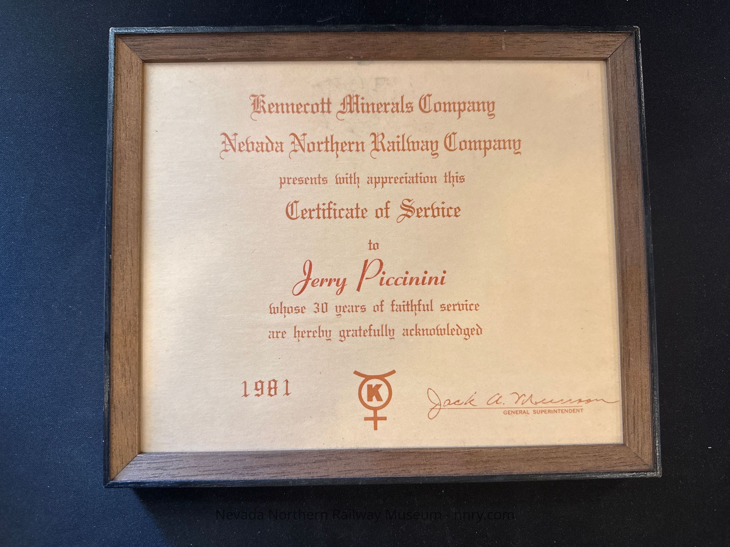 Certificate of Service presented to Jerry Piccinini for 30 years of service, 1981.Category