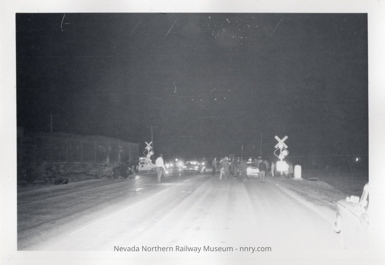 Automobile driven by Leonard Hall after colliding with a freight train at the McGill highway crossing, April 8, 1964.