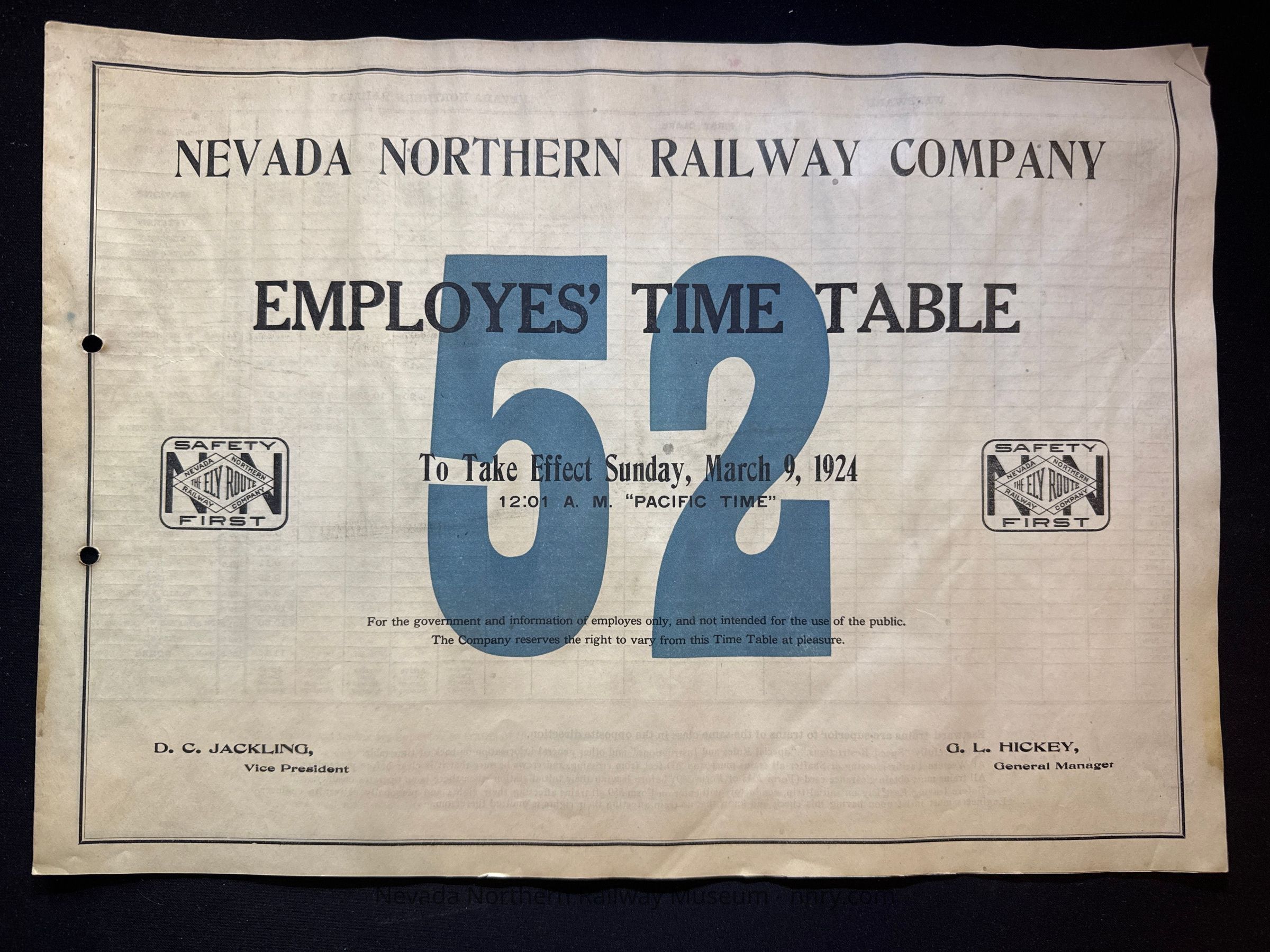 Nevada Northern Railway timetable no. 52, March 9, 1924.