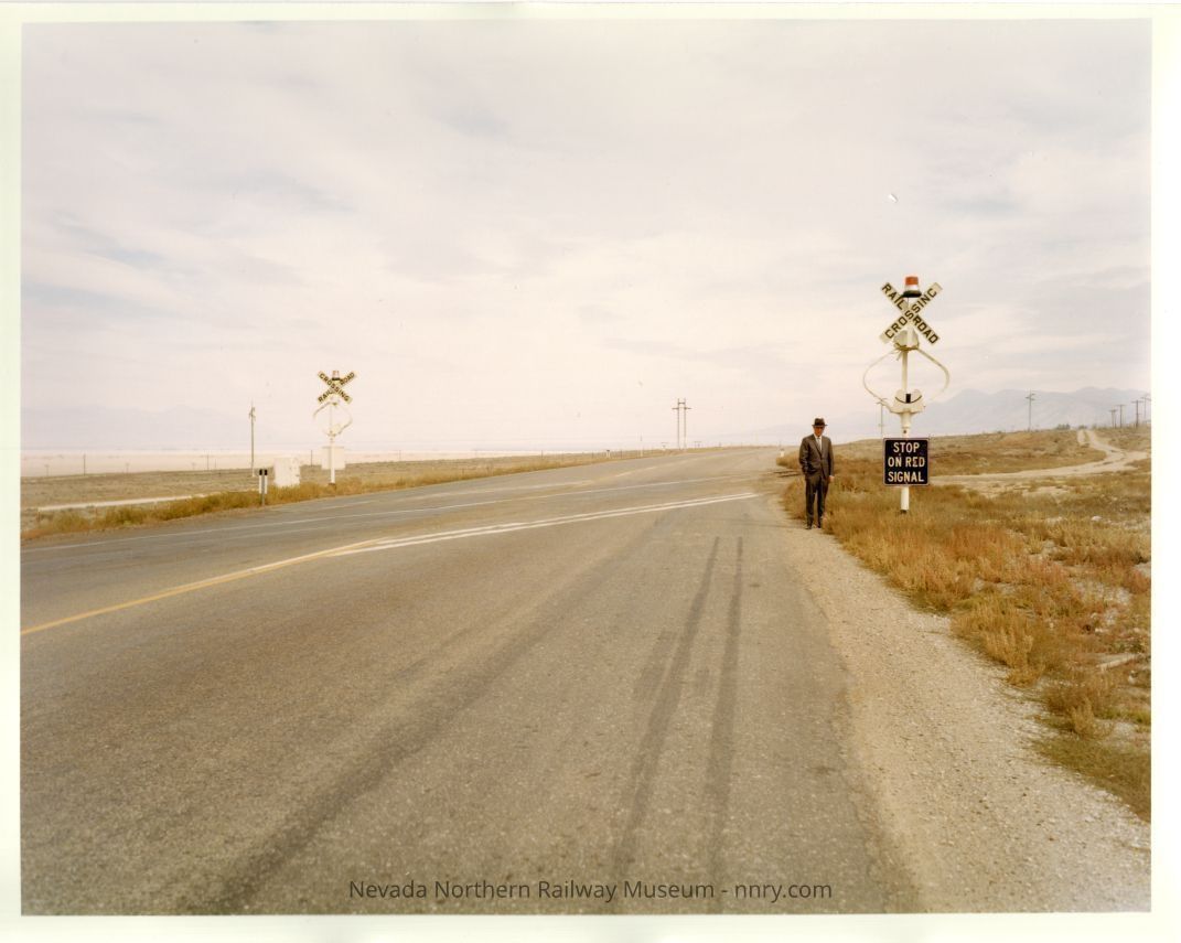 The wig wag crossing signal on the highway crossing at McGill with swinging signal replaced by a beacon light, man is believed to be H.M. Peterson, October 1965.Photograph Details