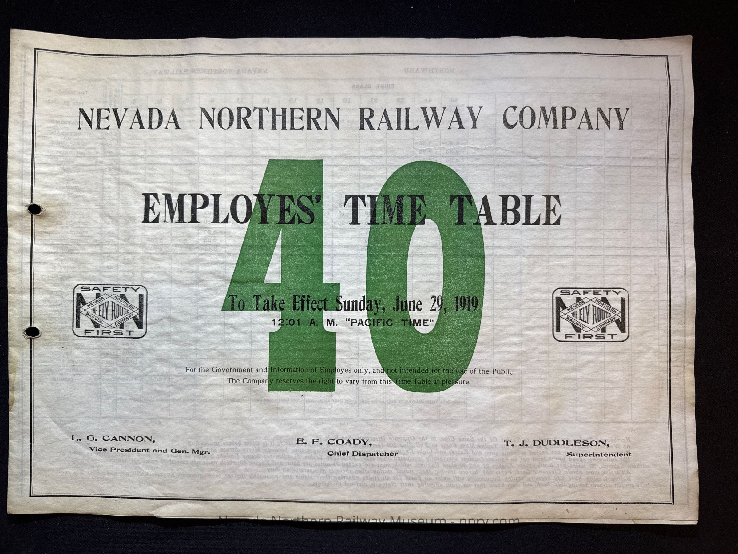 Nevada Northern Railway timetable no. 40, June 29, 1919.
