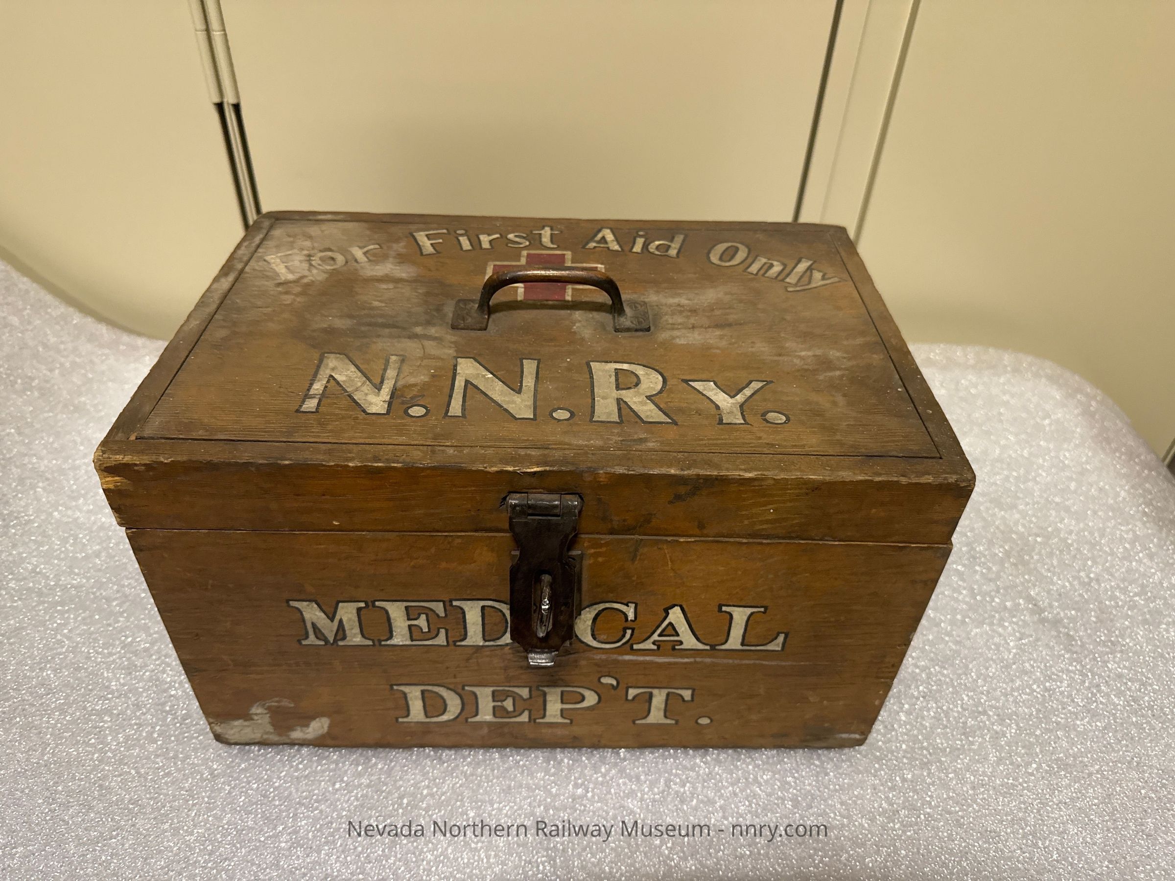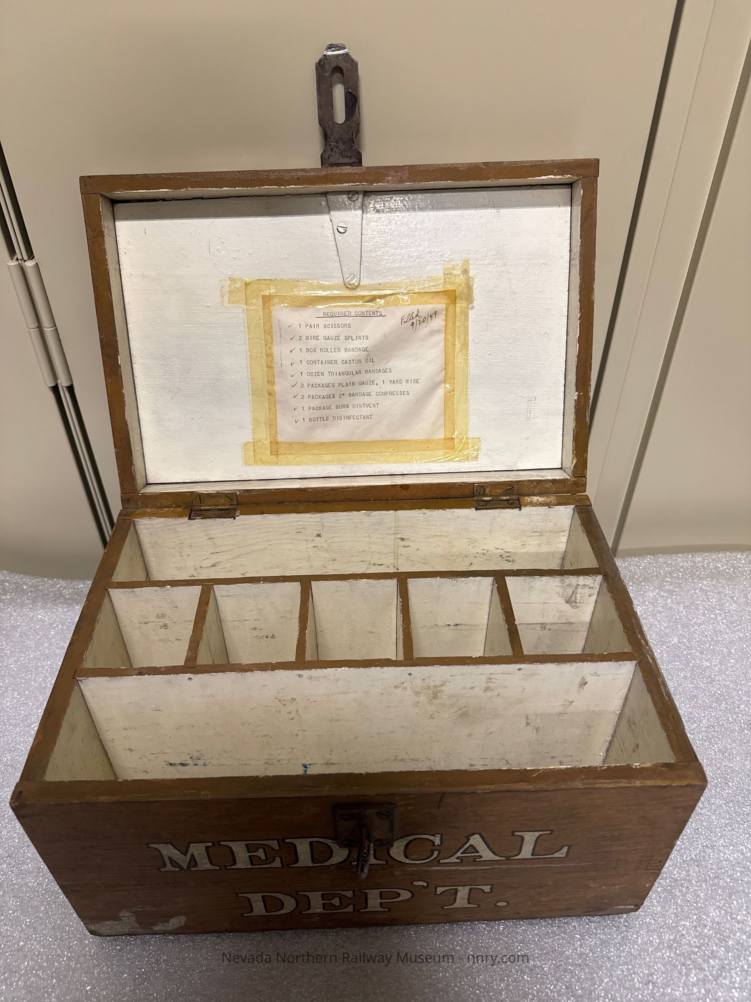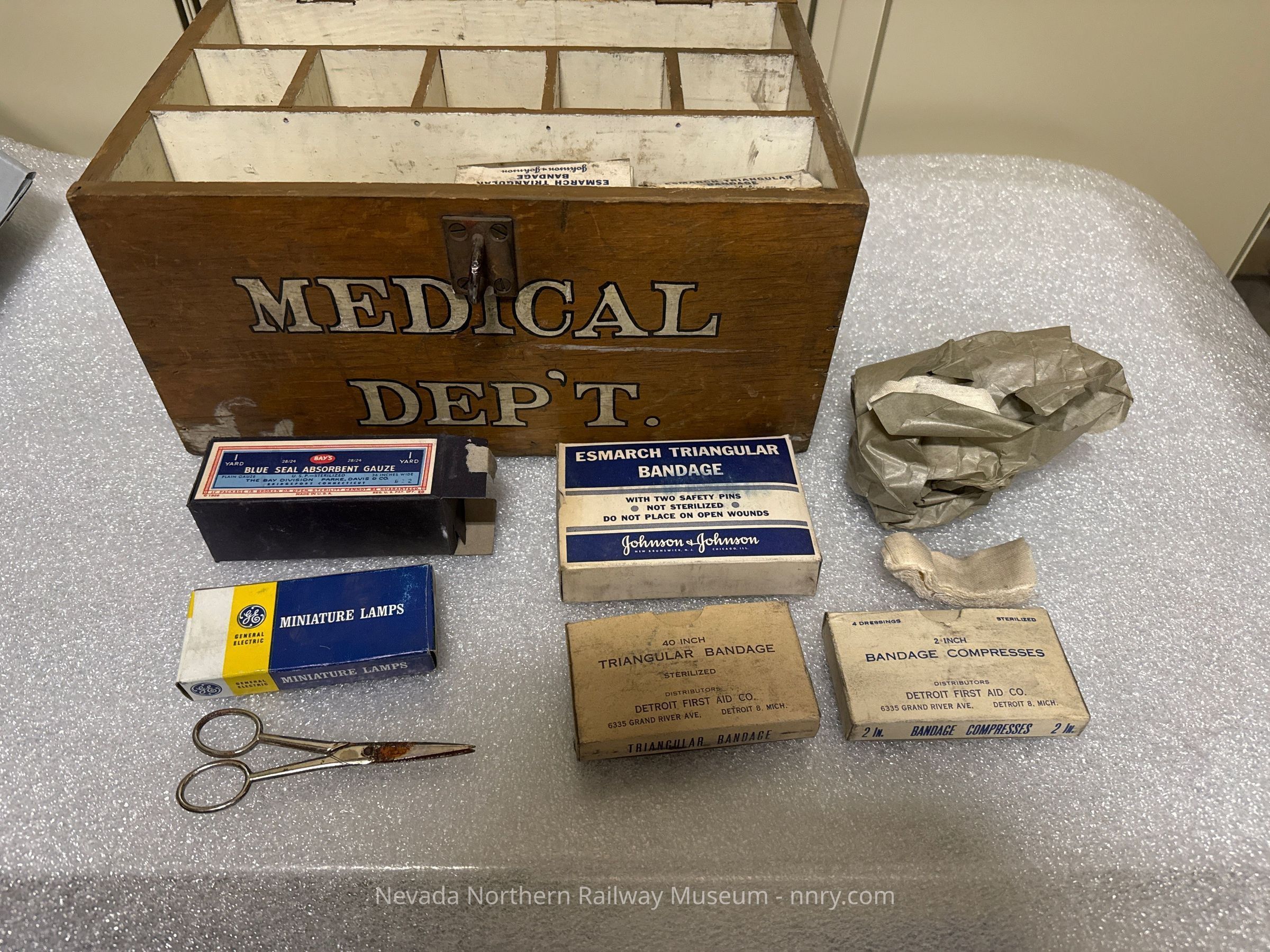 NNRy Medical Department first aid wooden box. "For First Aid Only // N.N.Ry." painted on the lid with a red cross and "MEDICAL // DEP'T." painted on the front, hinged lid, handle on top. Seven compartments on the inside, contents list taped to inside of lid. Contents: Two (2) 40-inch Triangular Bandage in boxes, two (2) 2-inch bandage compresses in boxes, one (1) box of miniature lamp bulbs, three (3) Esmarch triangular bandages in boxes, one (1) blue seal absorbent gauze in box, gauze in paper wrapper, two (2) loose bundles of gauze, one (1) pair of scissors. Box circa 1910s, last filled September 20, 1949.Category