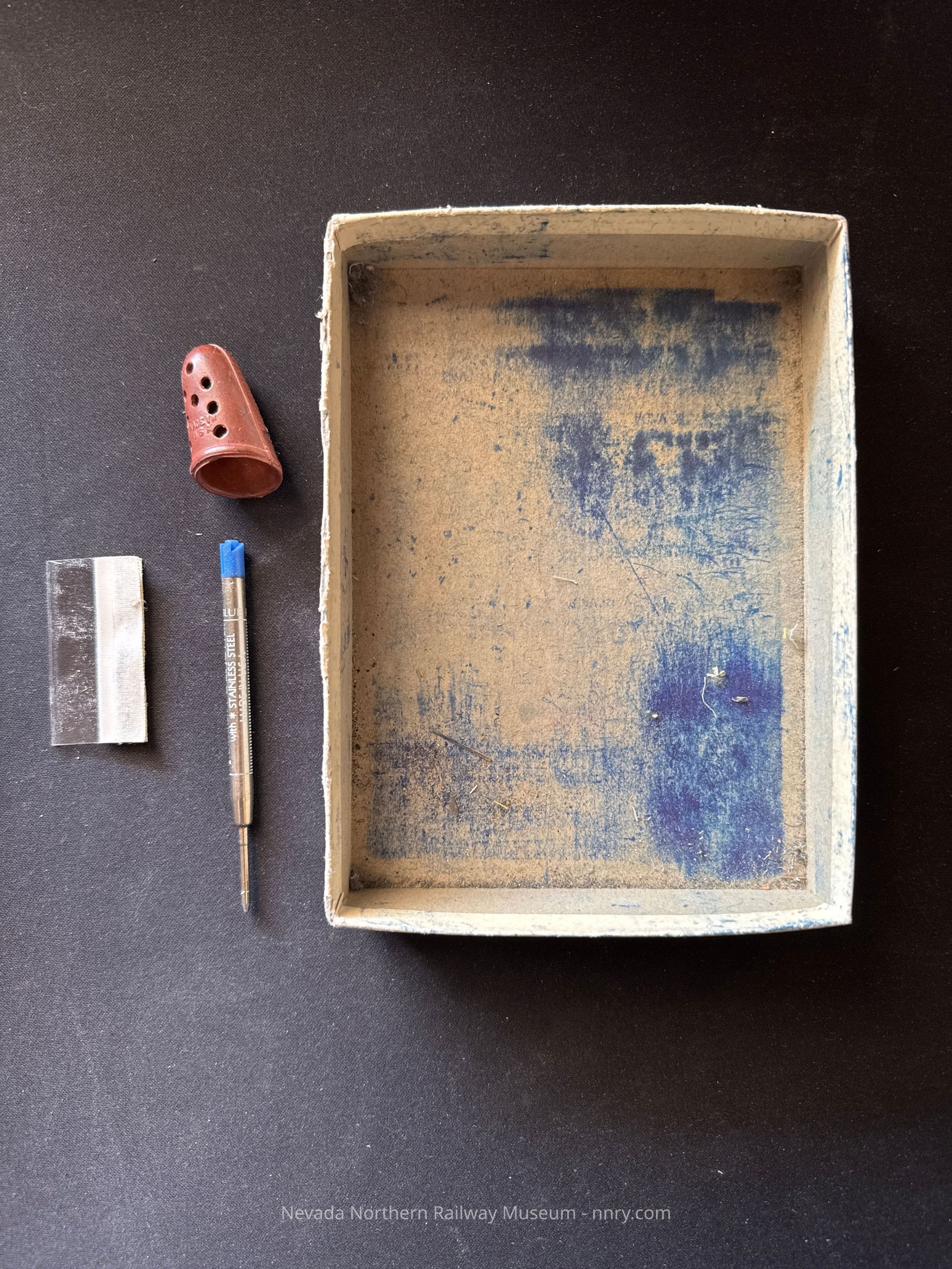 Cardboard box used as an office tray with a rubber thimble, ball point pen replacement and index tab.Category