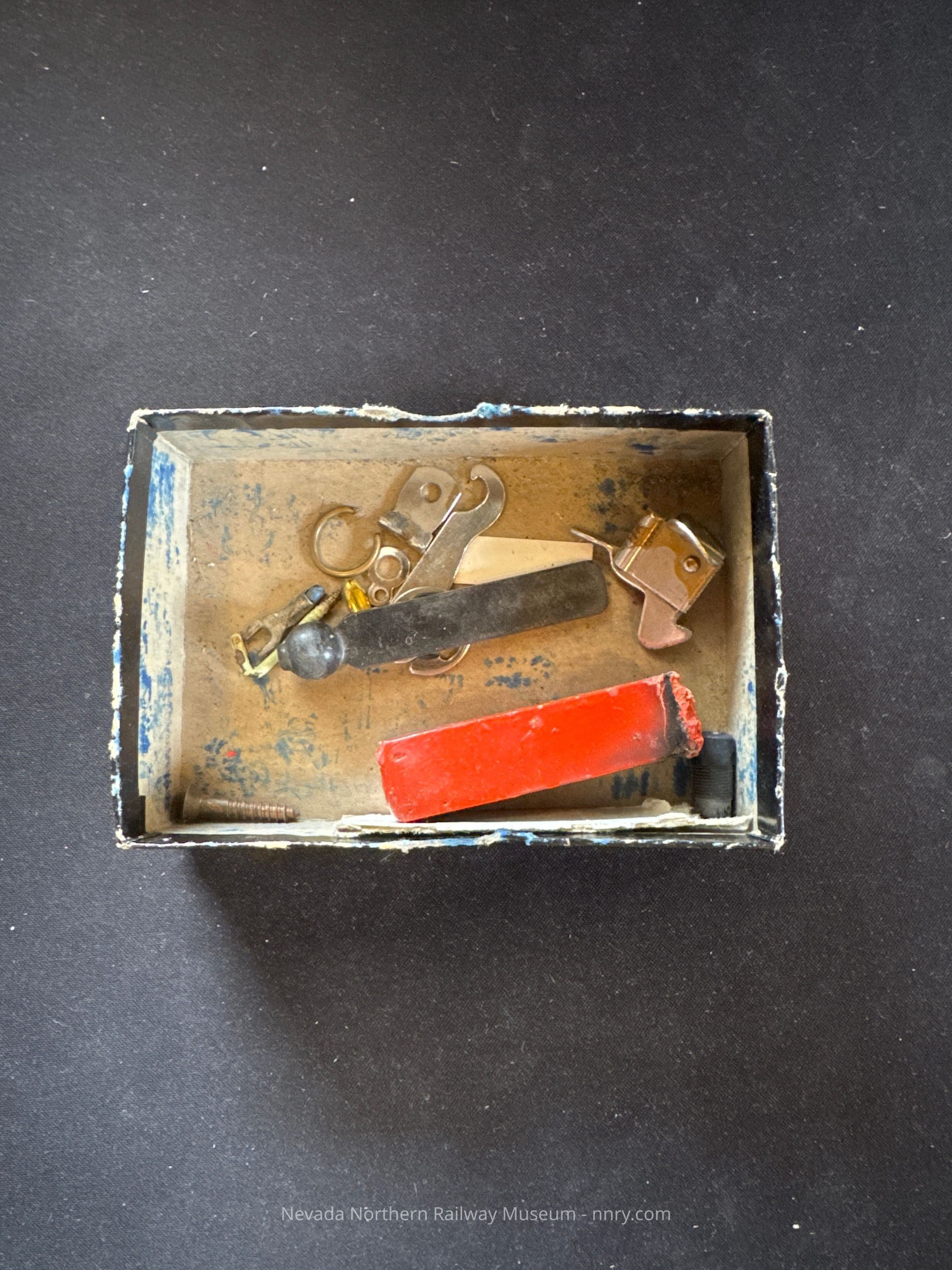 Cardboard box used as a tray, contains misc. office materials and parts including seal wax, hooks, latch, etc.Made/Created