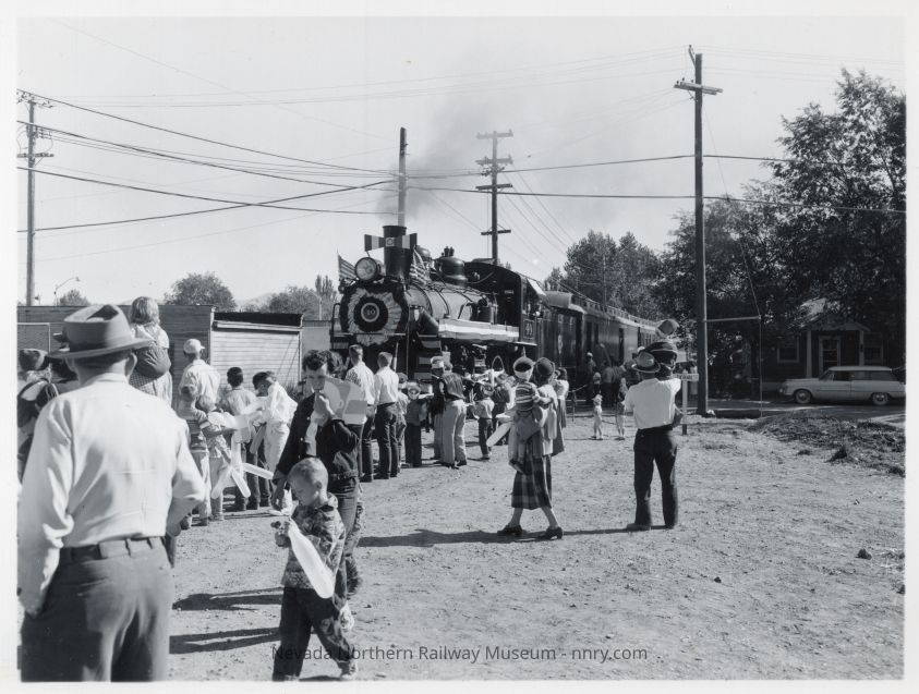 Locomotive #40 arriving with the 50th Anniversary excursion train at the Ely depot, September 1956.