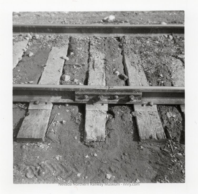 Pumping ties and swinging ties, tie on right hanging on the rail by the spikes, taken on the ore line about MP 140.5, from a report by Harold E. Grier, 1967.Photograph Details