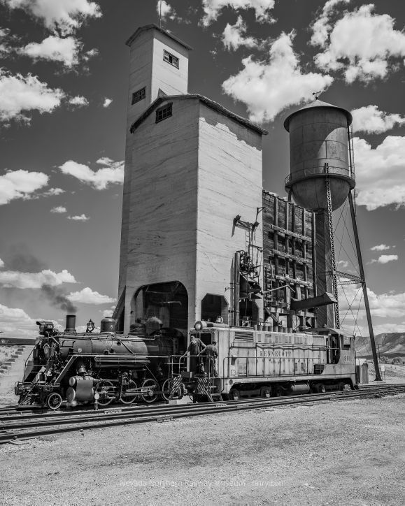 Locomotives #81 and #801 at the coaling tower, Trainmaster Con Trumbull and Master Mechanic John Henry McDonnell on the running board of #801, July 1, 2022.