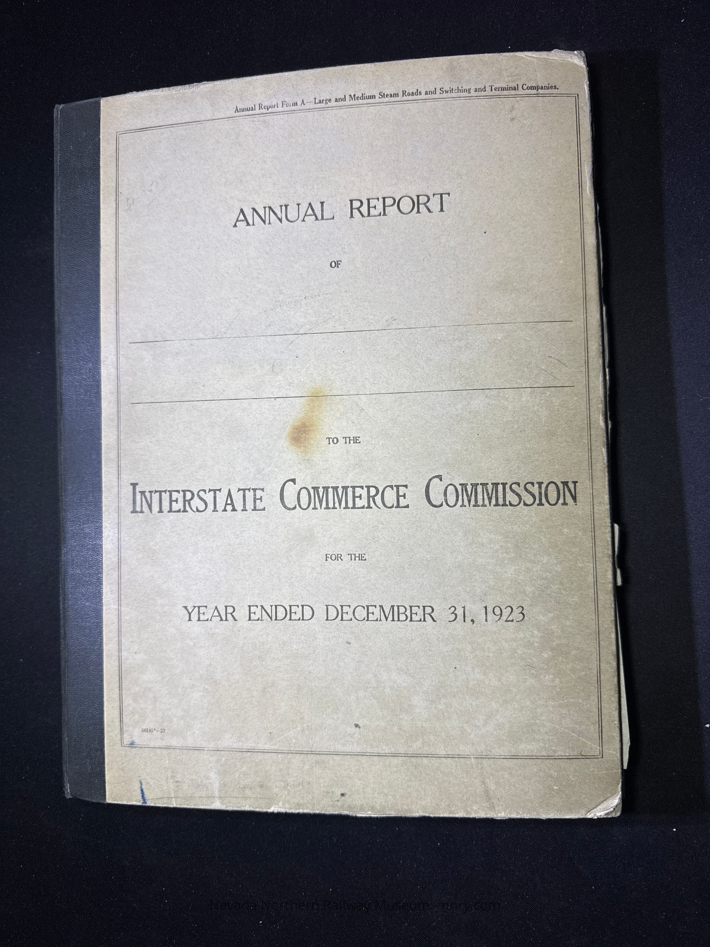 Annual report from the NNRy to the ICC for 1923, includes additional sheet of information between the pages, office file copy for the Auditor's office in East Ely.Creator