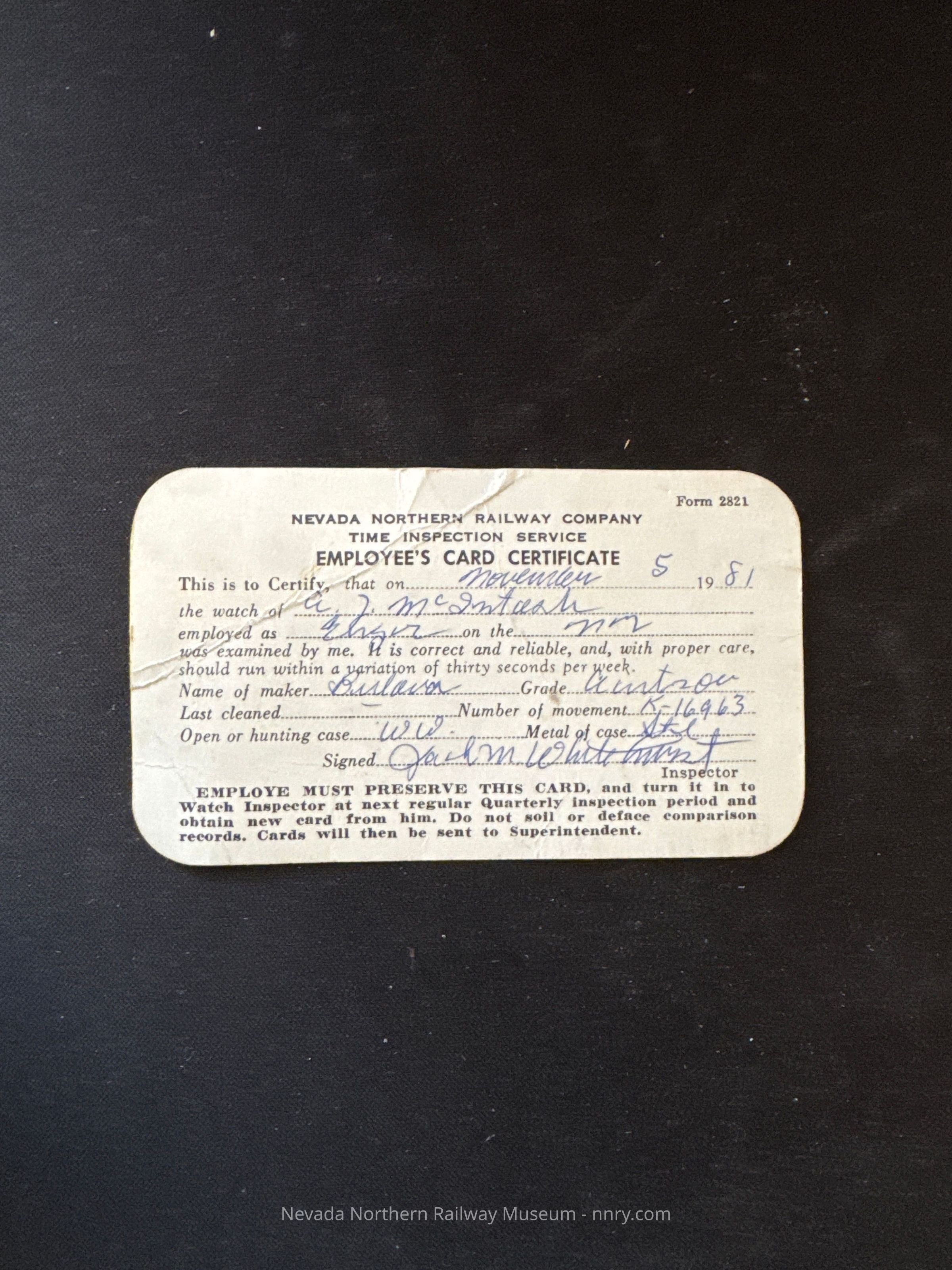 Employee's card certificate for time inspection service, form no. 2821, issued to A.J. McIntosh inspected by J.N. Whitehurst, November 5, 1981.Creator