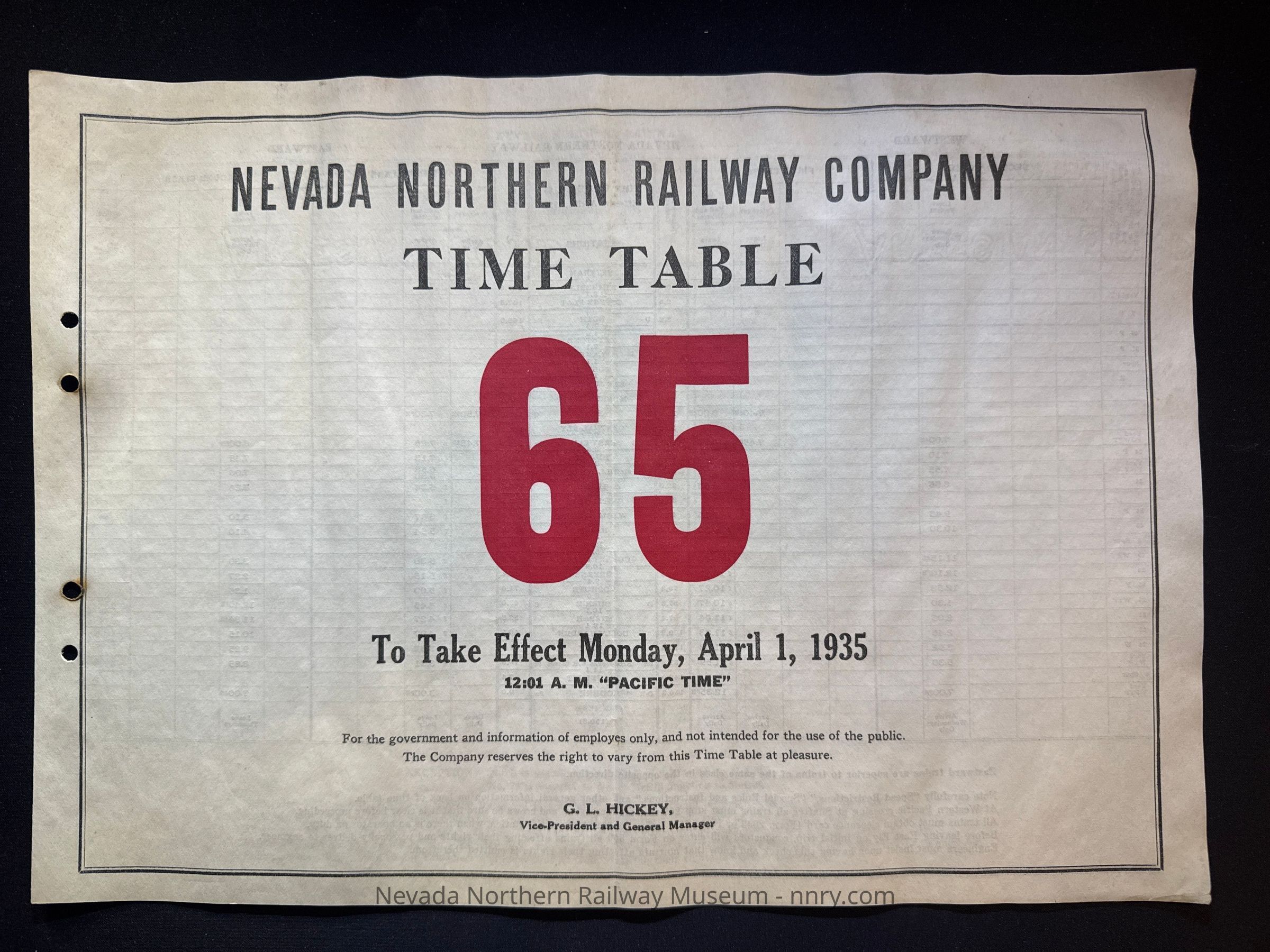 Nevada Northern Railway timetable no. 65, April 1, 1935.