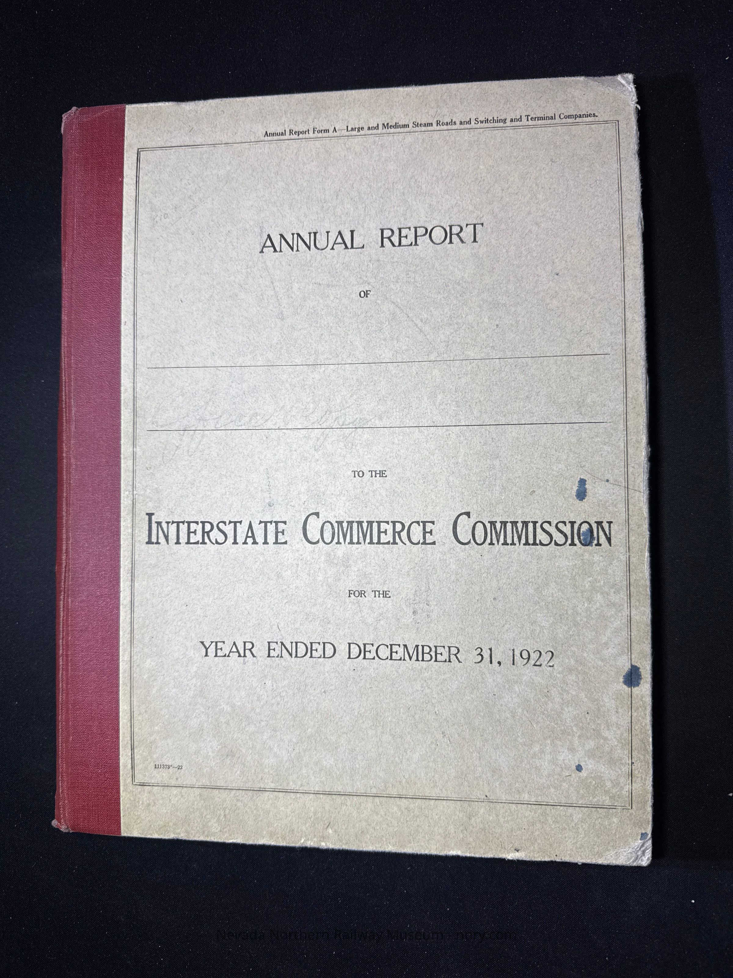 Annual report from the NNRy to the ICC for 1922, includes additional sheet of information between the pages, office file copy for the Auditor's office in East Ely.Creator