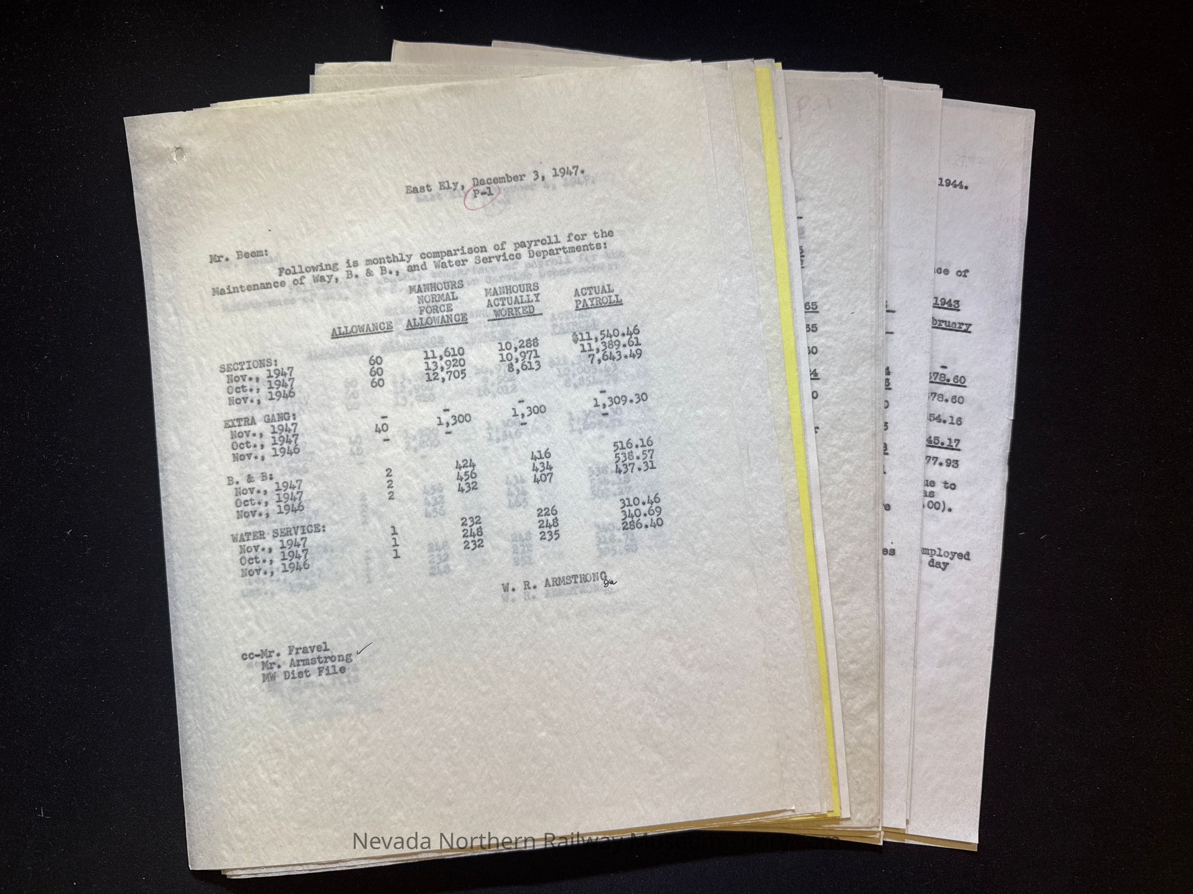 Reports on payroll comparisons for the MOW department, 1944-1947.