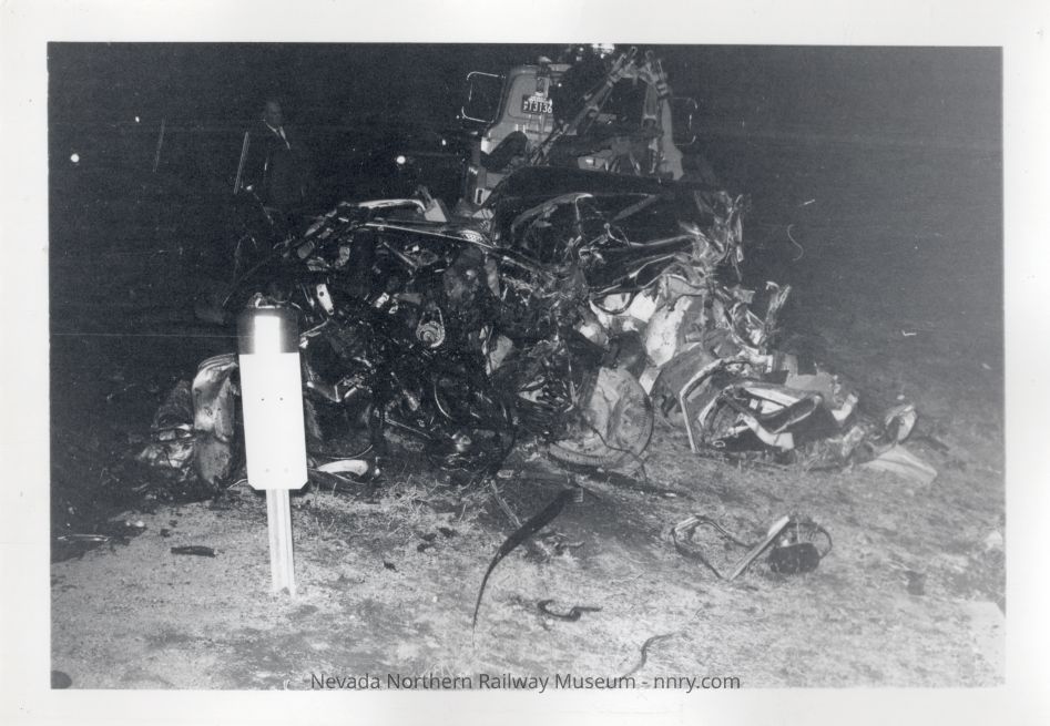 Remnants of the automobile driven by Leonard Hall after colliding with a freight train at the McGill highway crossing, April 8, 1964.Photograph Details