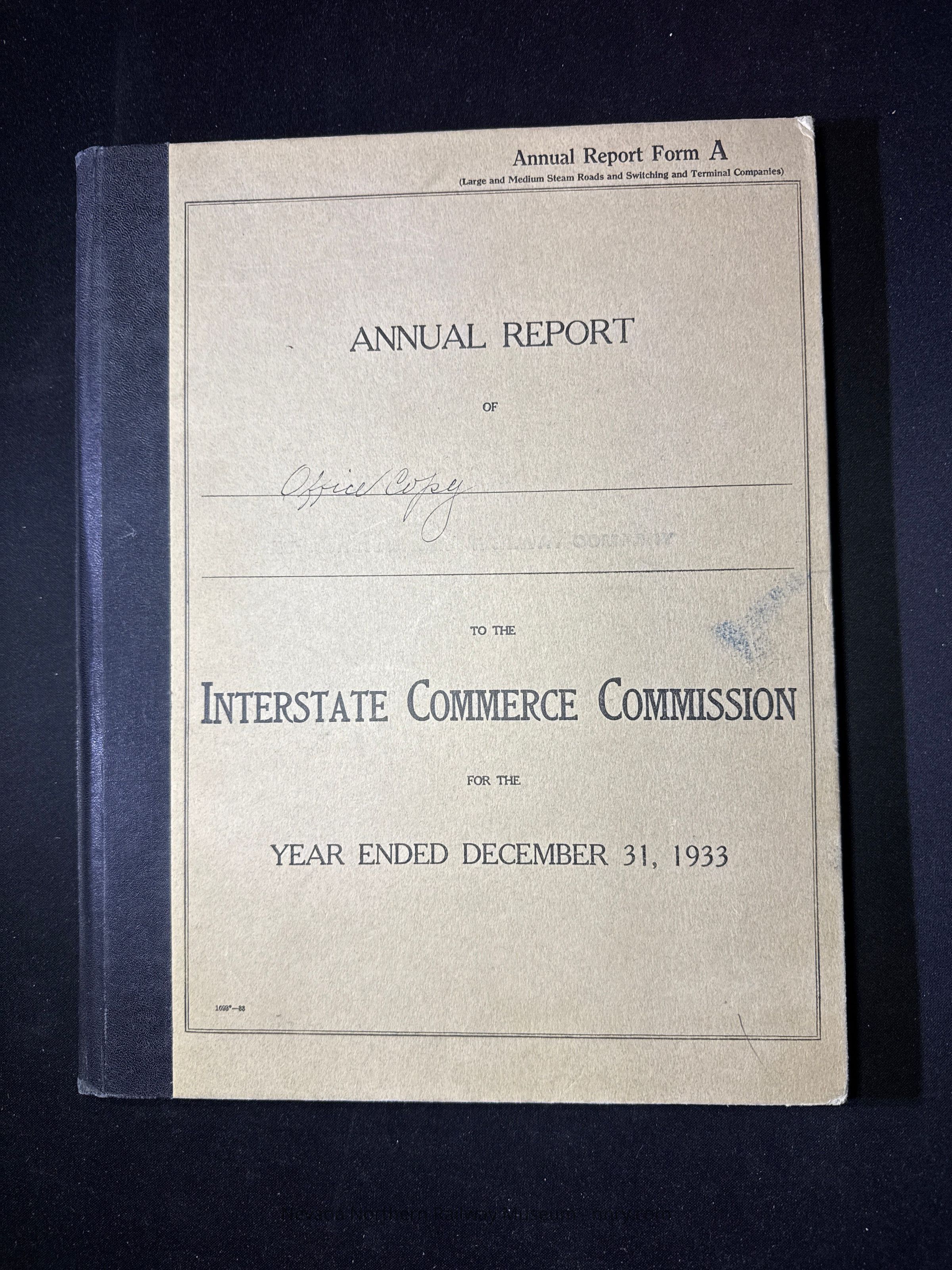 Annual report from the NNRy to the ICC for 1933, includes additional sheet of information between the pages, office file copy for the Auditor's office in East Ely.Creator