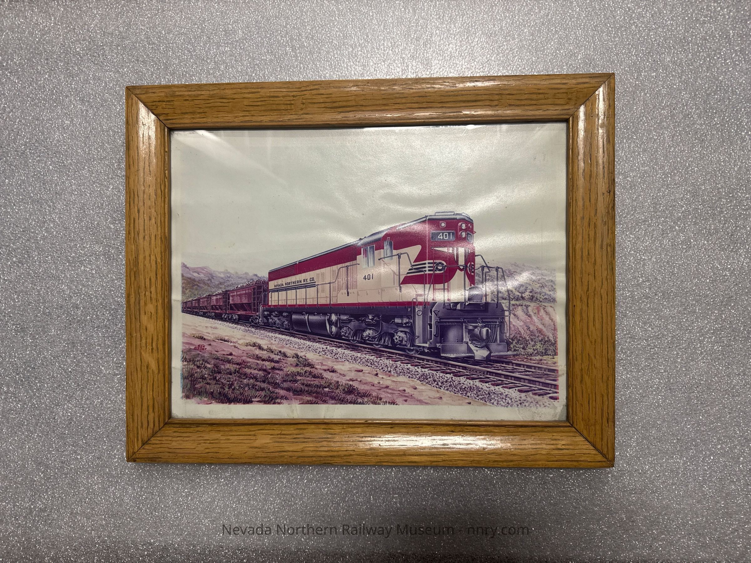 EMD artist rendition of locomotive #401 in the "Desert Warbonnet" paint scheme, in wooden frame, circa 1951.Category