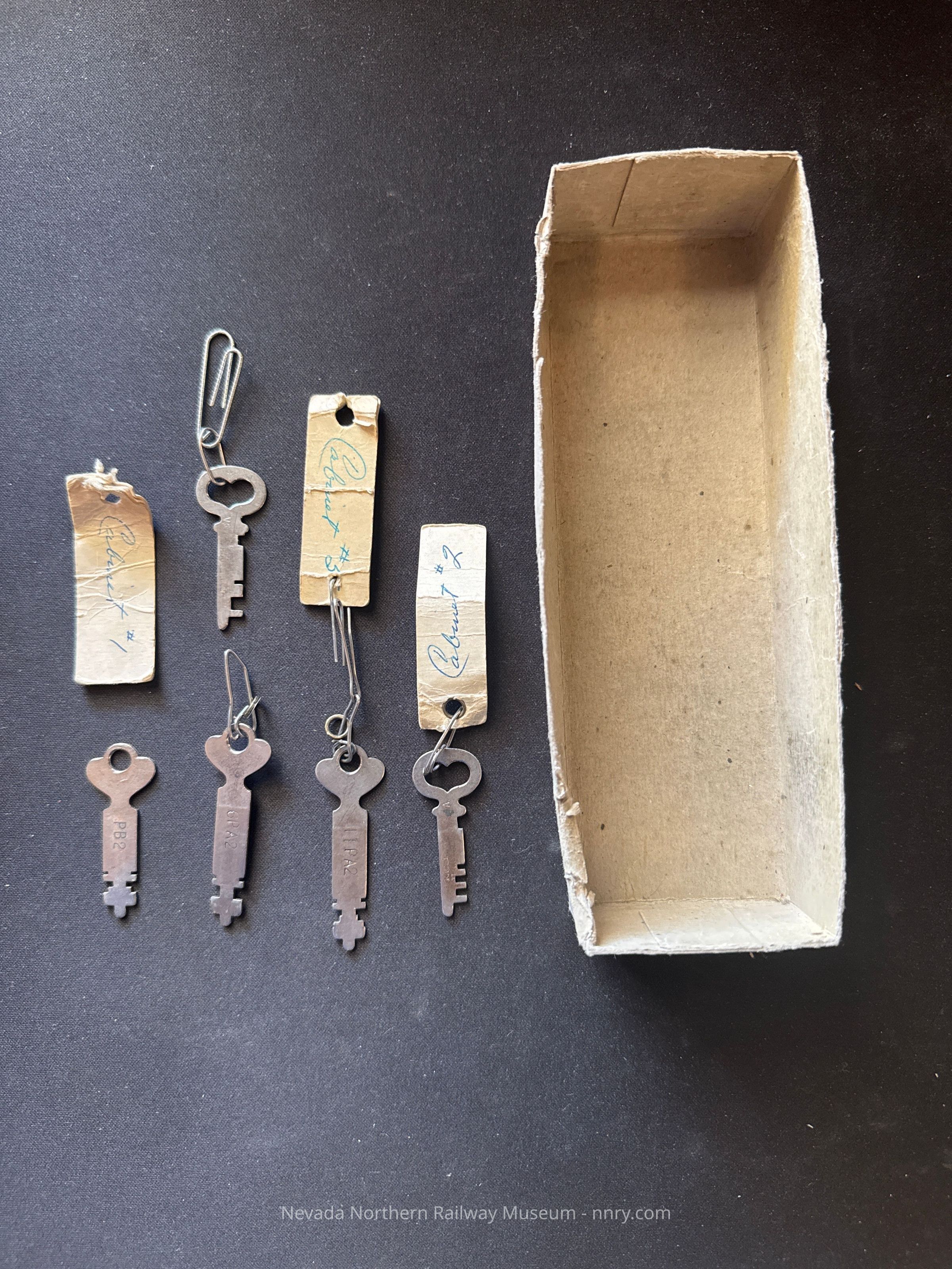 Tray of cabinet keys, two labeled for cabinets 2 and 5, three keys with no labels and one loose label for cabinet 1. Two keys made by Corbin, two by eagle and one unknown.Acquisition