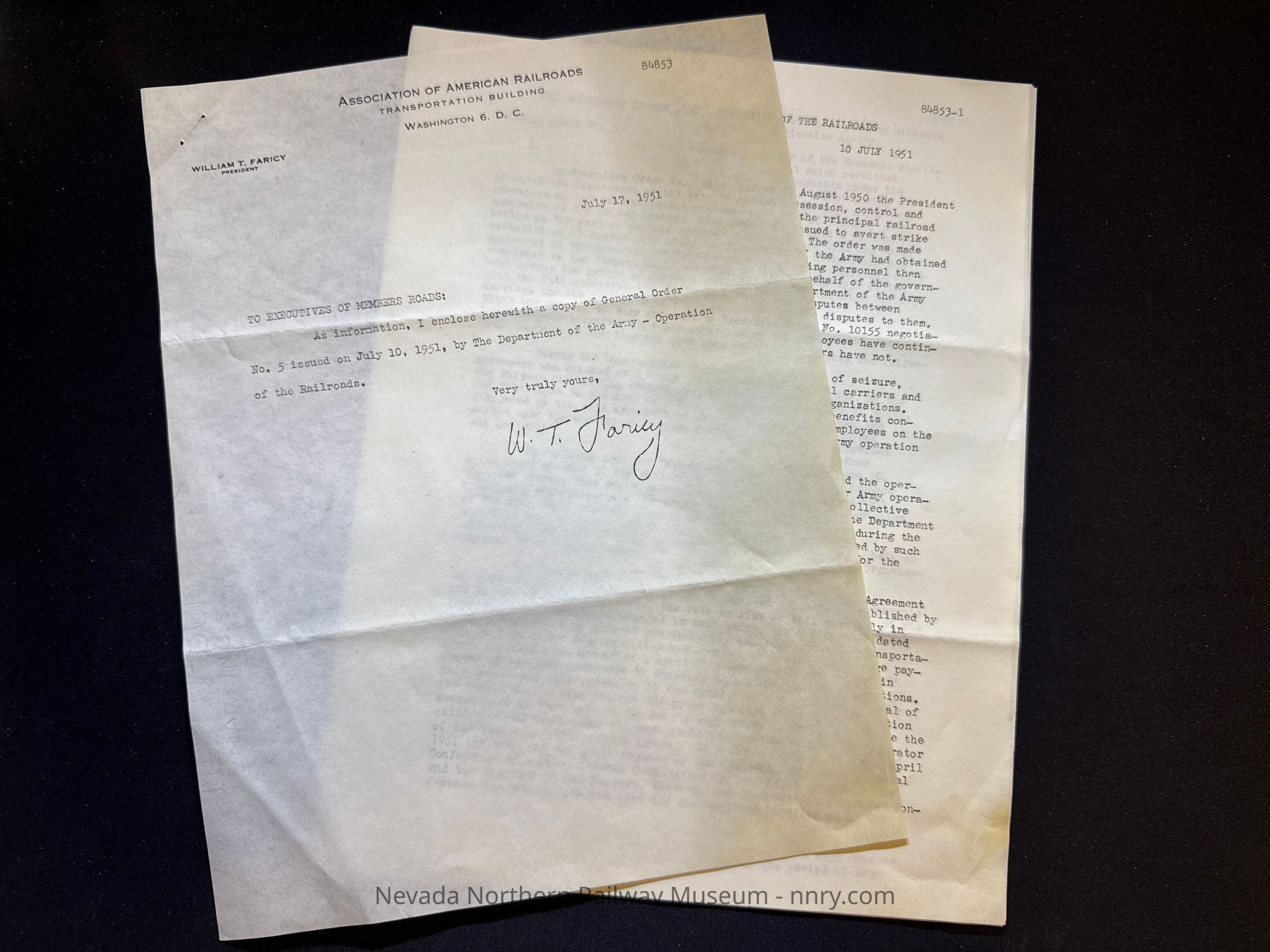 Correspondence regarding the Army's General Order Number 5 regarding the operation of railroads, July 1951.