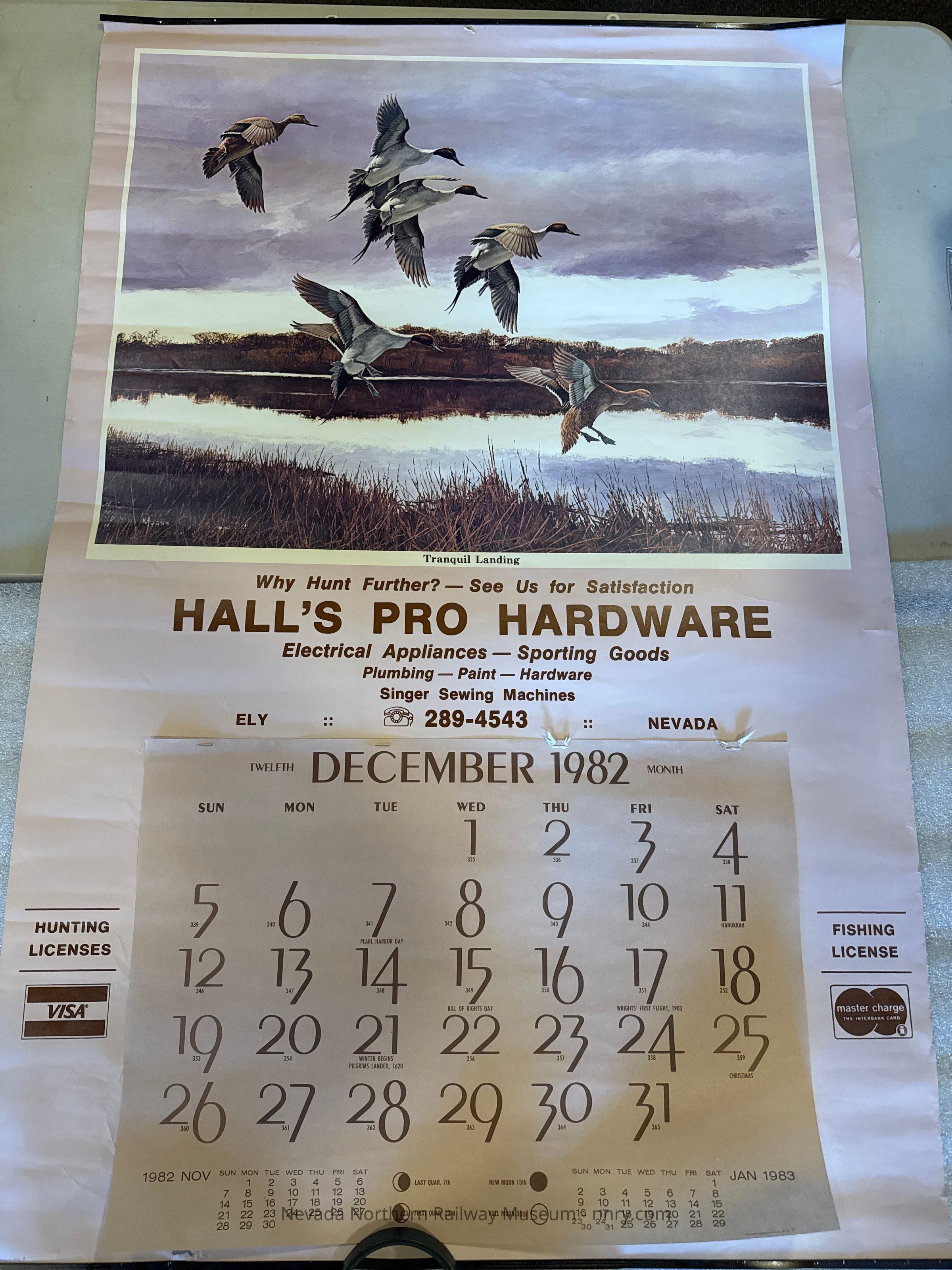 Wall calendar from Hall's Pro Hardware for the year 1982, all pages but December torn off. Calendar is on a poster with an image of ducks called "Tranquil Landing."Creator
