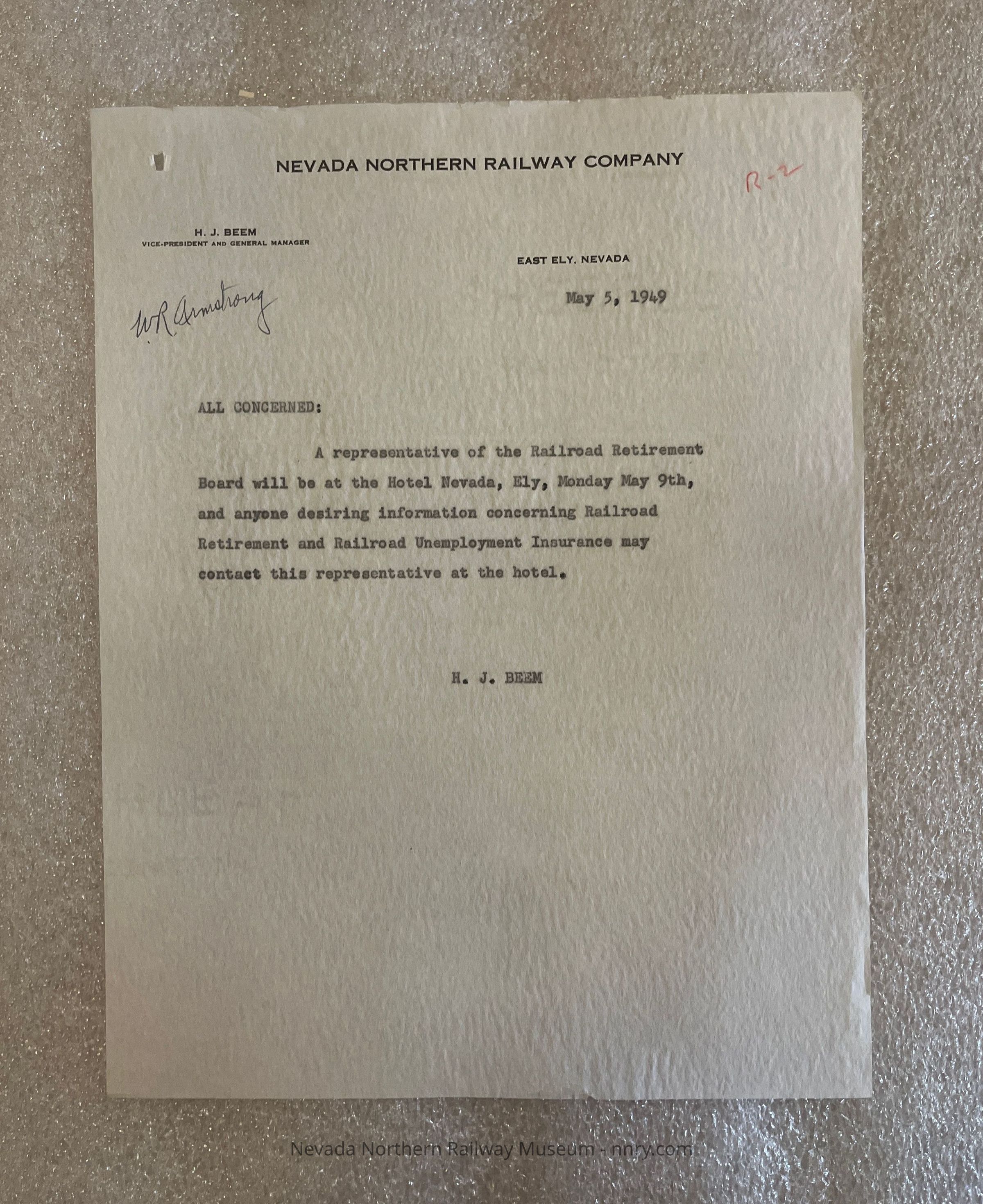 Correspondence regarding a visit by a Railroad Retirement Board representative, May 5, 1949.