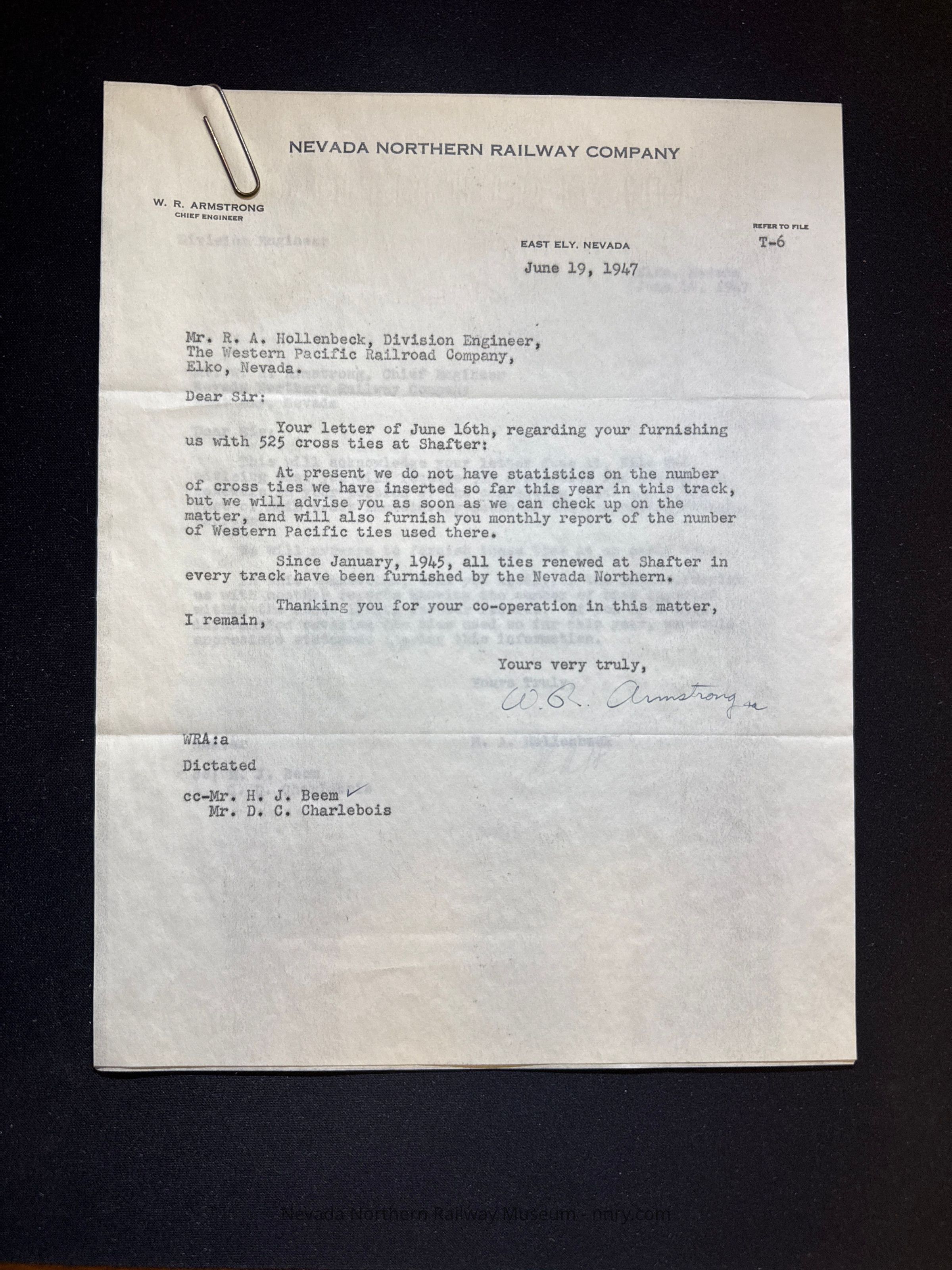 Request by the NNRy for the Western Pacific to furnish 525 cross ties on the connecting track and NN mainline to put it in proper condition for the operation of WP power, June 1947.Creator