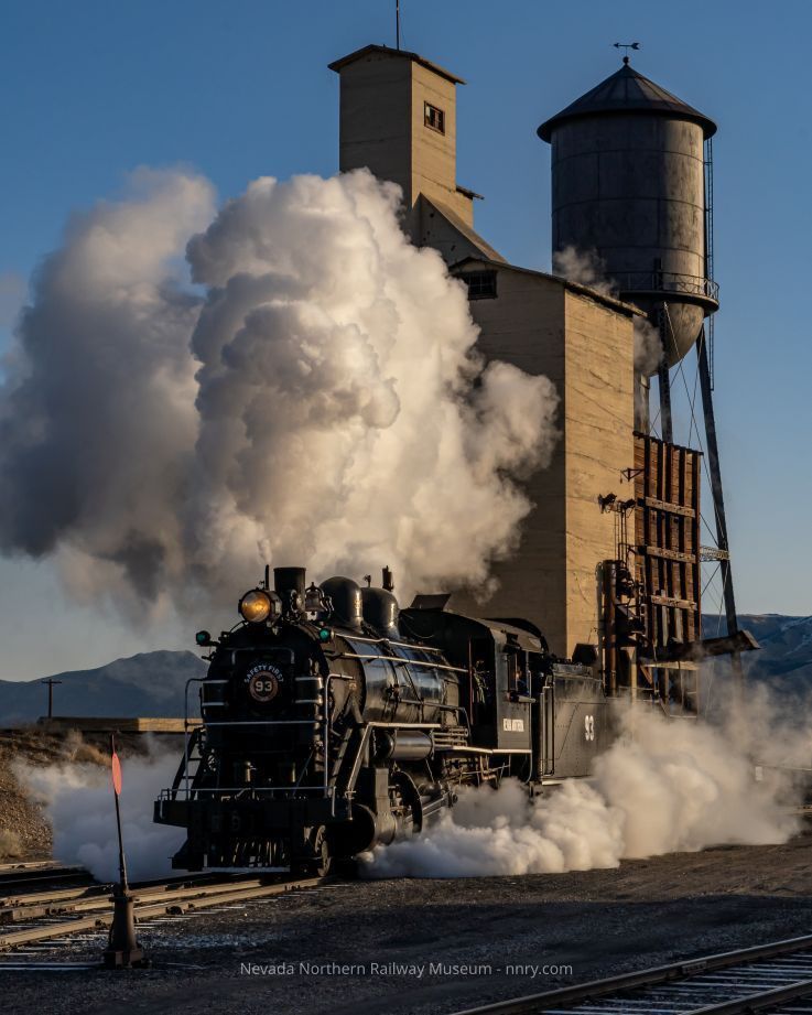 Locomotive #93 passing the coaling tower in the morning, February 2024.