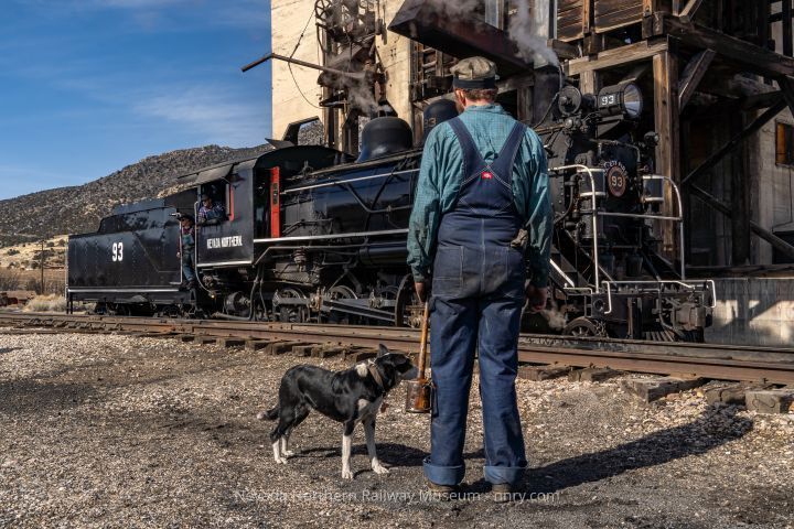 Lennox Purinton watching locomotive #93 with Millie the dog, Mike Hughes looking from cab, Will Ebbert in the gangway, February 2024.