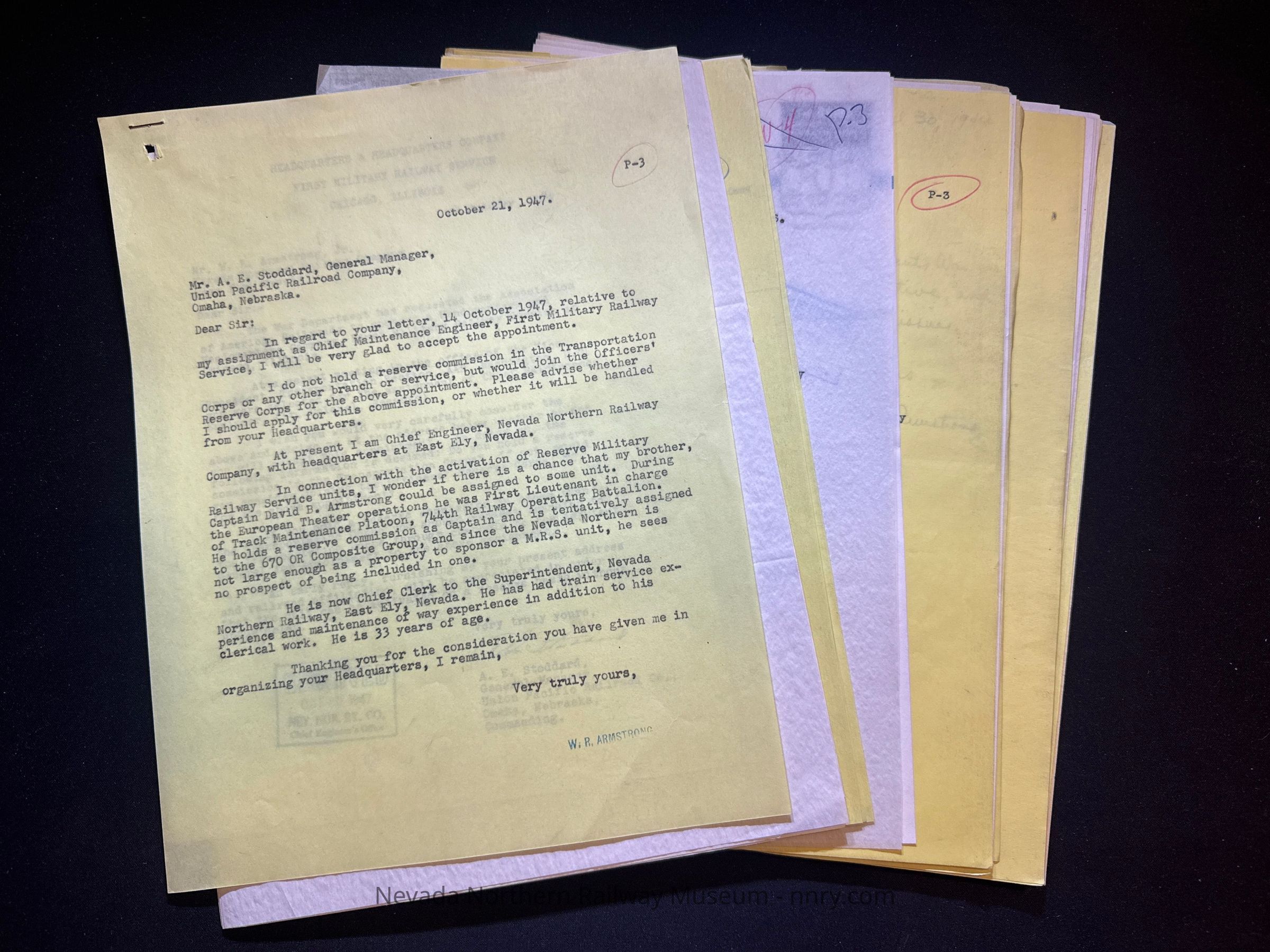 Correspondence regarding the appointment of W.R. Armstrong as Chief Maintenance Engineer, Lt. Colonel Reserve, First Military Railway Service, and request that a position be found for his brother David B. Armstrong, October 1947.Creator