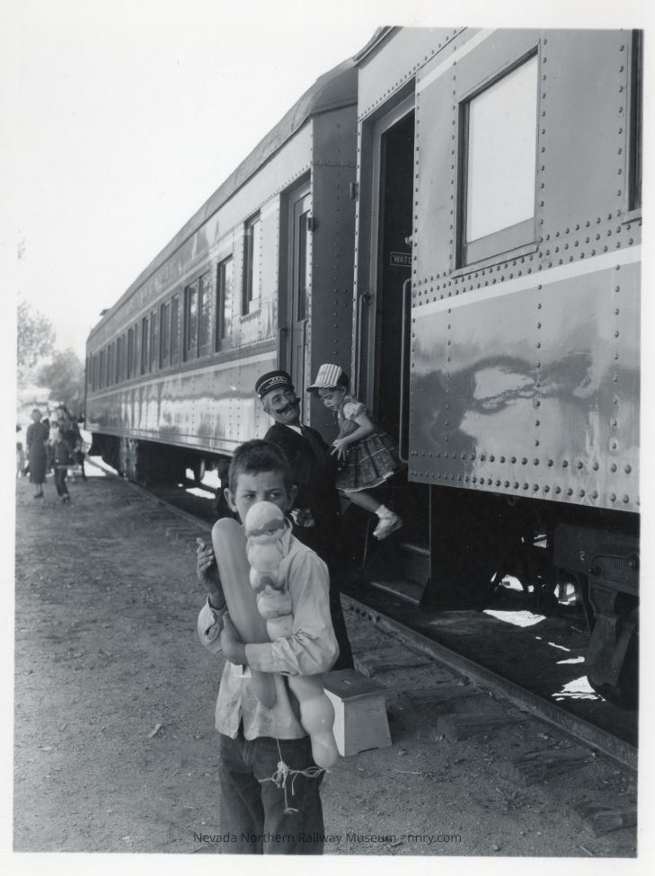 Children getting off of a leased Southern Pacific coach on the 50th Anniversary train, September 1956.