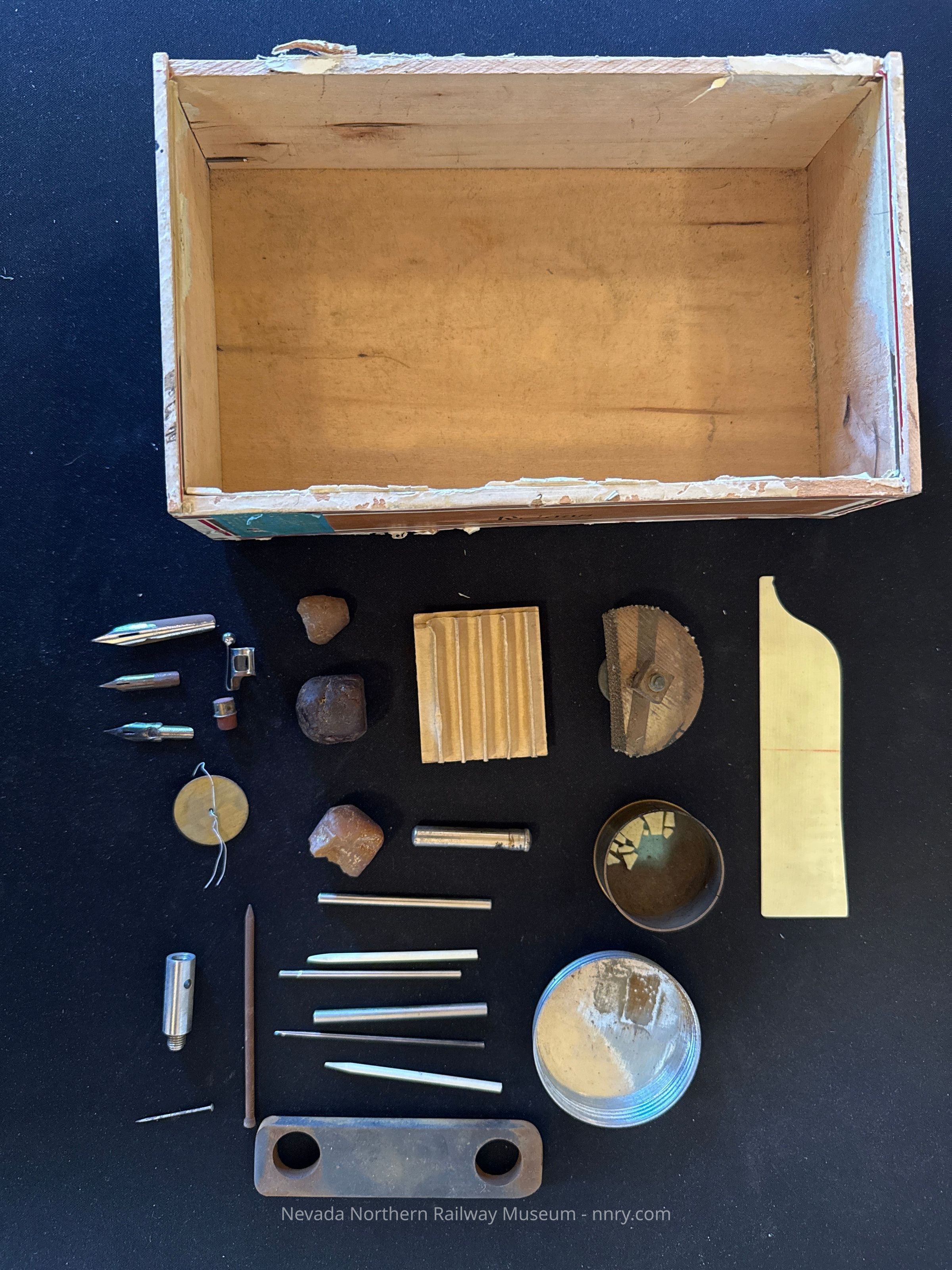 Box of miscellaneous items including a plastic gauge, file book pins, erasers, nibs, and various parts. Box is a Thompson's Cigar box.Category