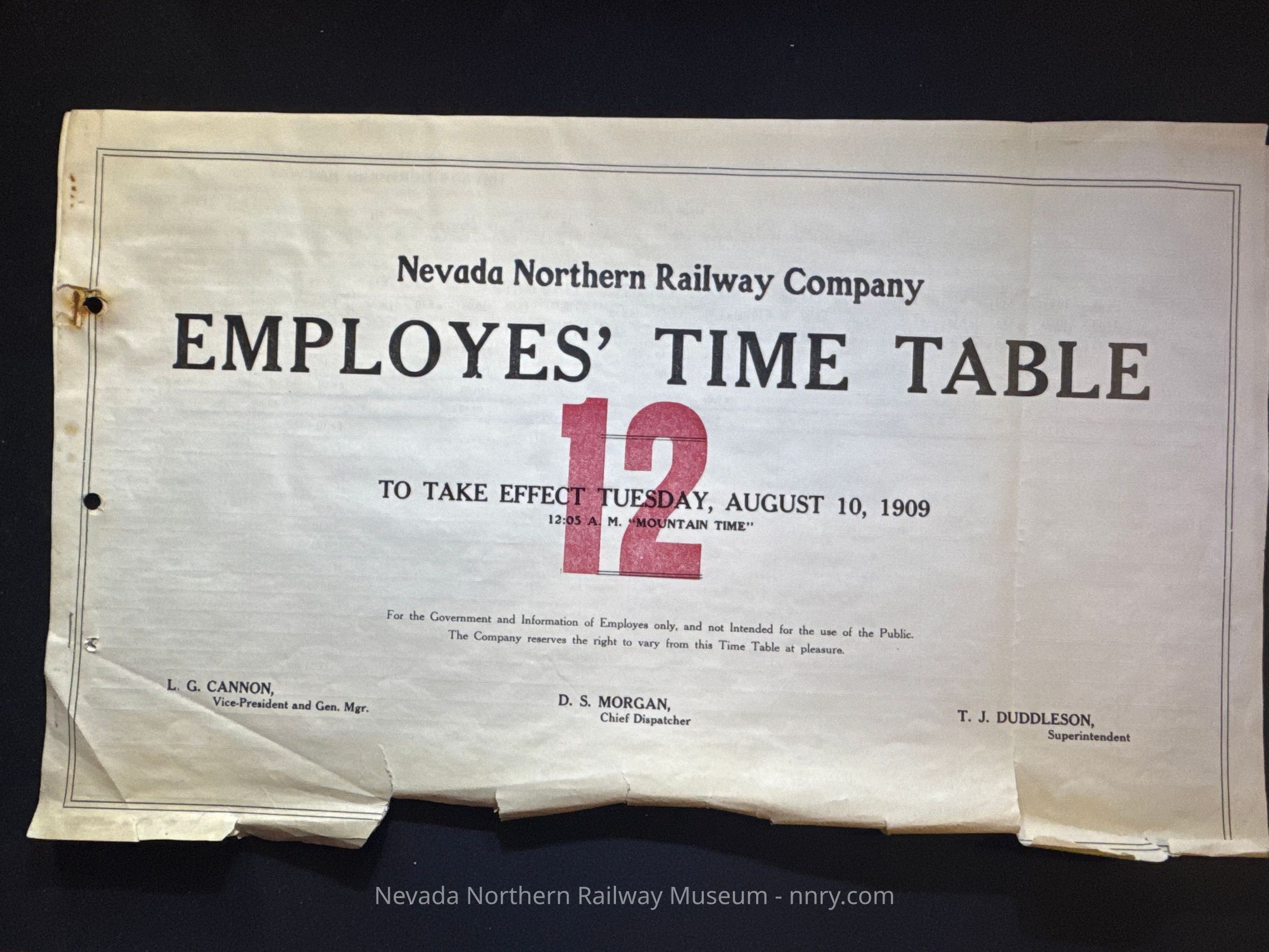 Nevada Northern Railway timetable no. 12, August 10, 1909.