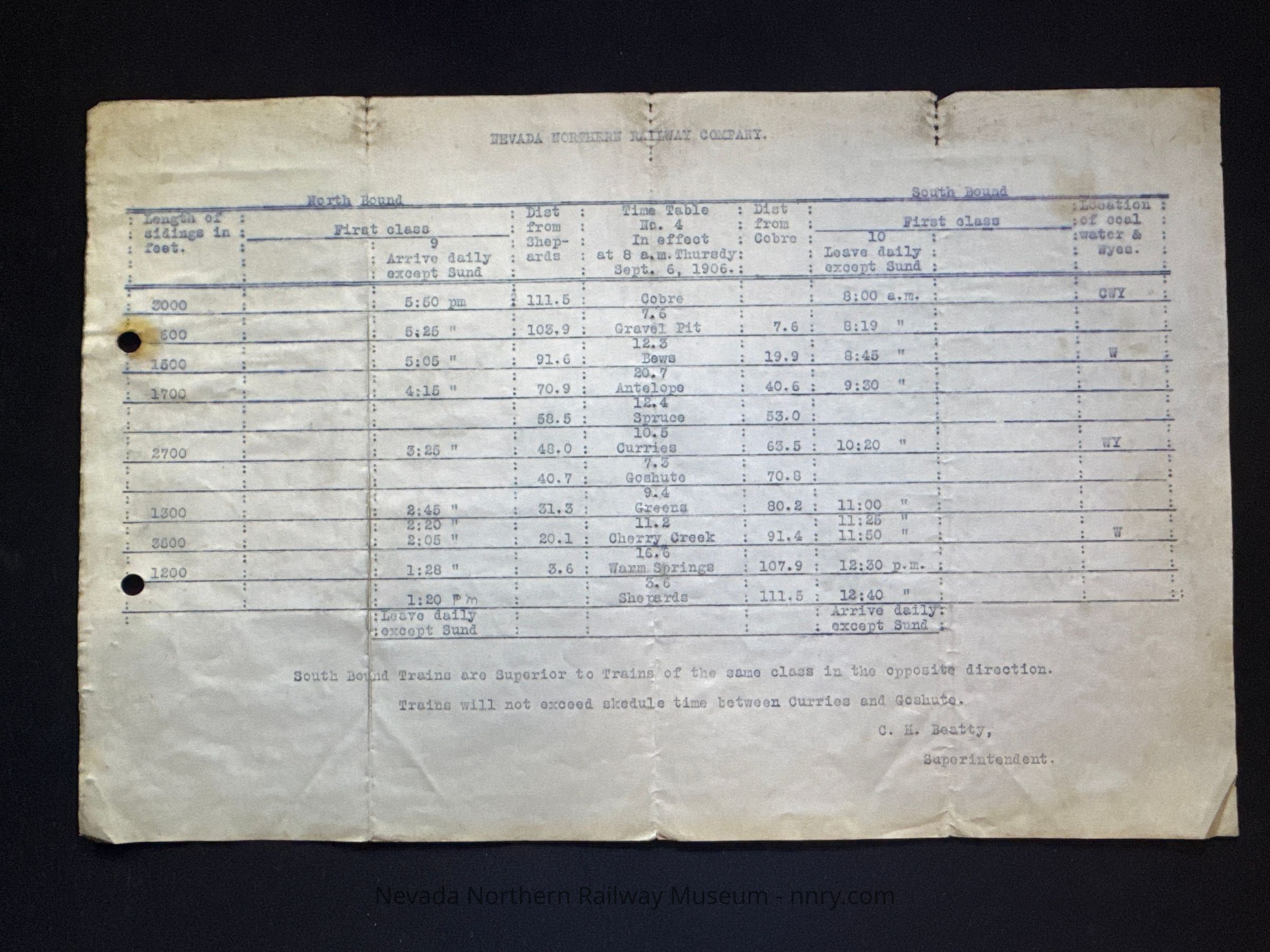 Nevada Northern Railway timetable no. 4, showing schedule between Cobre and Shepards, September 6, 1906.