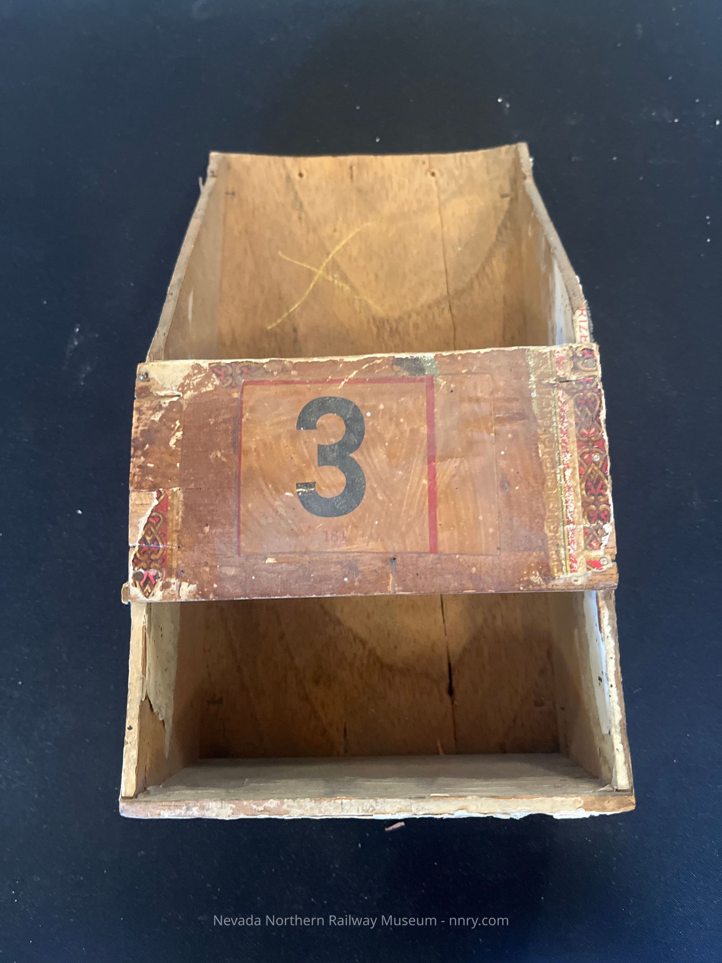 Paper holder, possible to sit on a desk or hang on a wall, or a desk drawer replacement drawer, label "3" on front. Made by a railroad employee from an old cigar box dated January 21, 1915, most likely used by a drafter.Acquisition