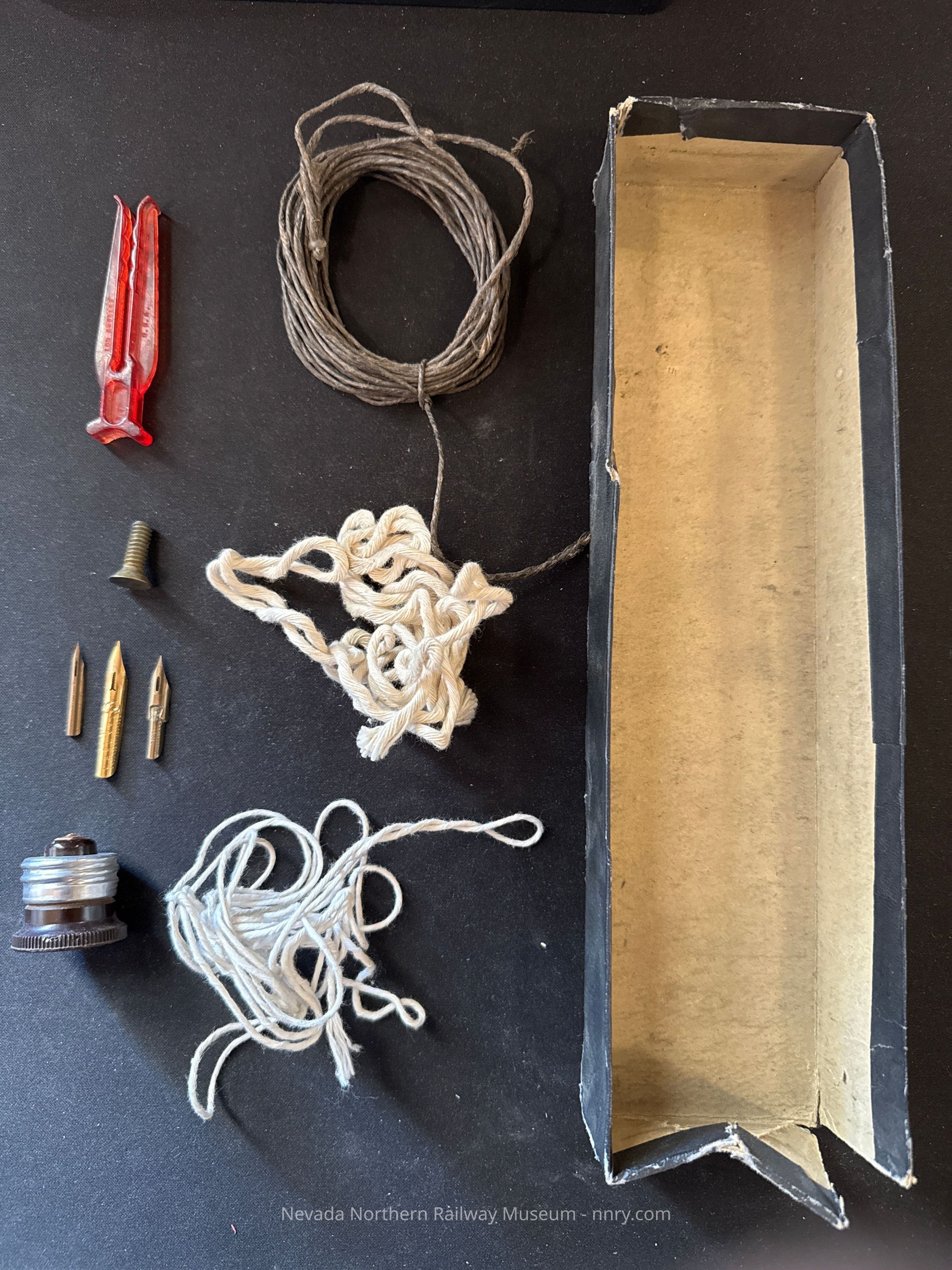 Office tray containing two lengths of string, one roll of cord, three steel nibs, one screw, one plastic clip and one outlet adaptor for a light socket.Category
