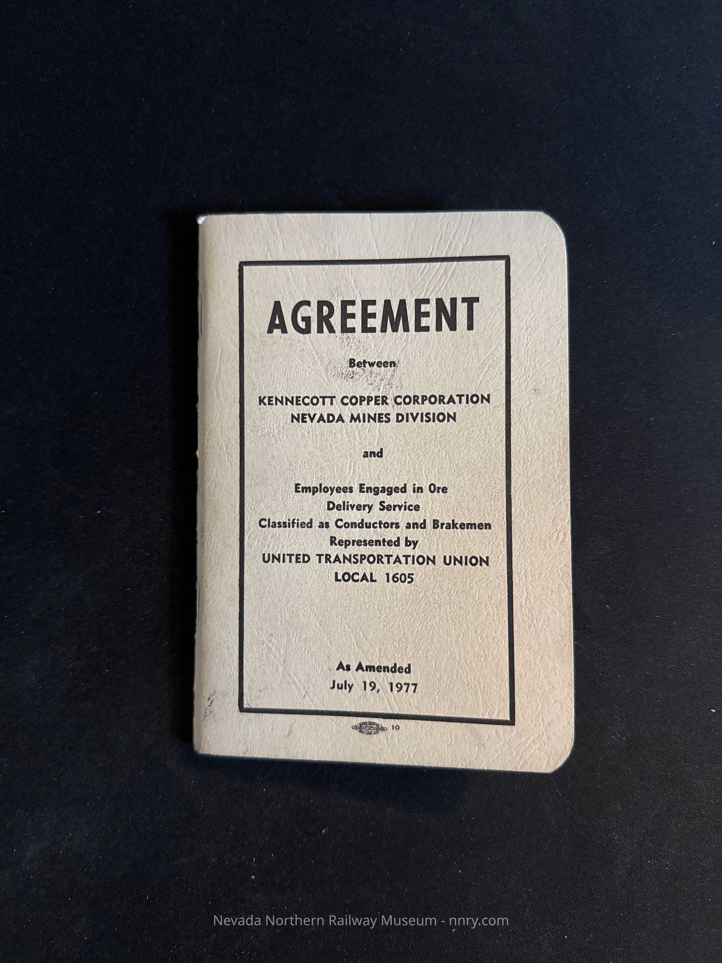 Booklet containing the agreement between the Nevada Mines Division of KCC and employees engaged in Ore Delivery Service classified as Conductors and brakemen represented by the United Transportation Union Local 1605.Relationships