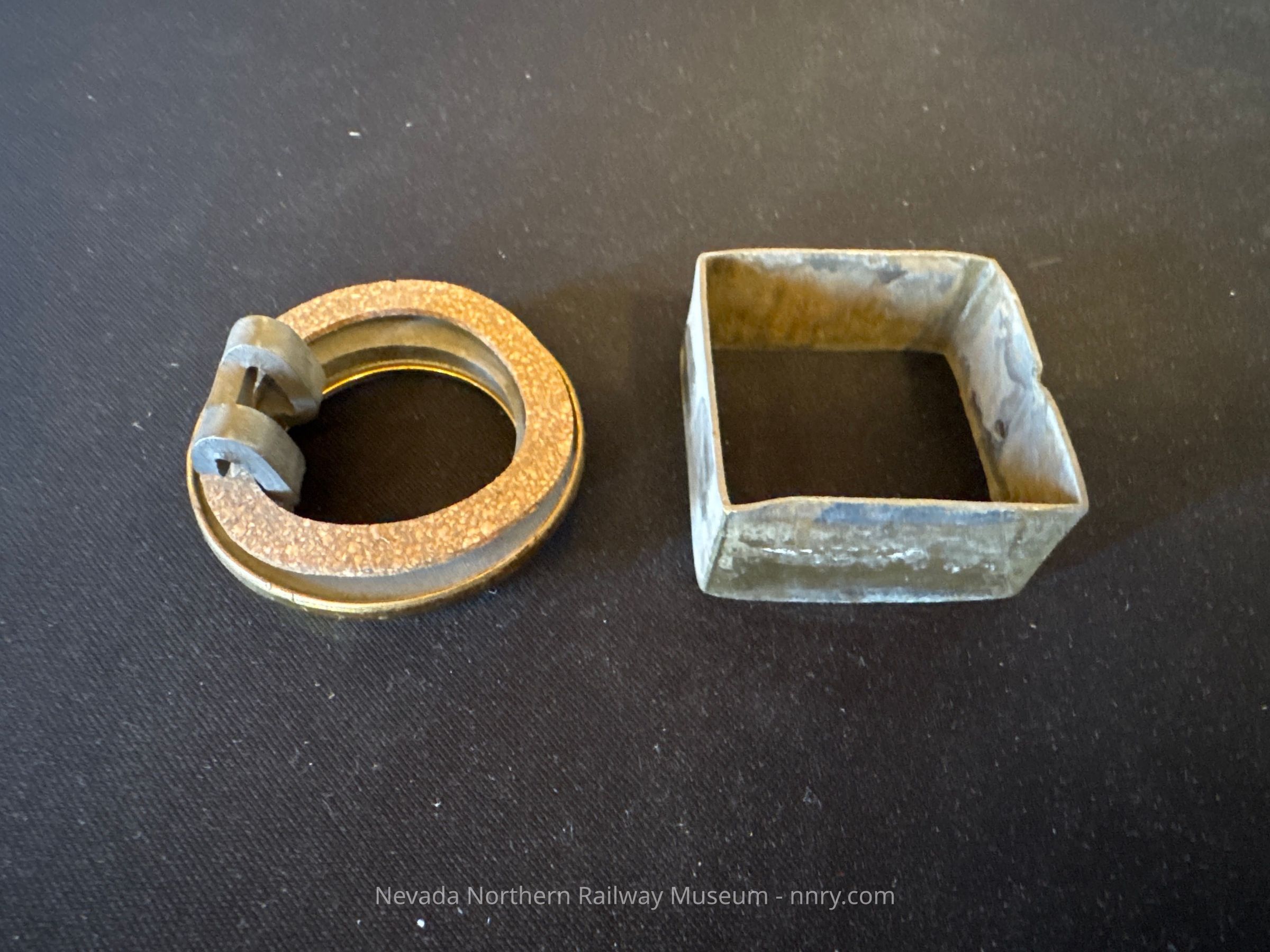 Two unidentified brass parts. One is a brass square, other appears to be hinged with a gasket.Acquisition