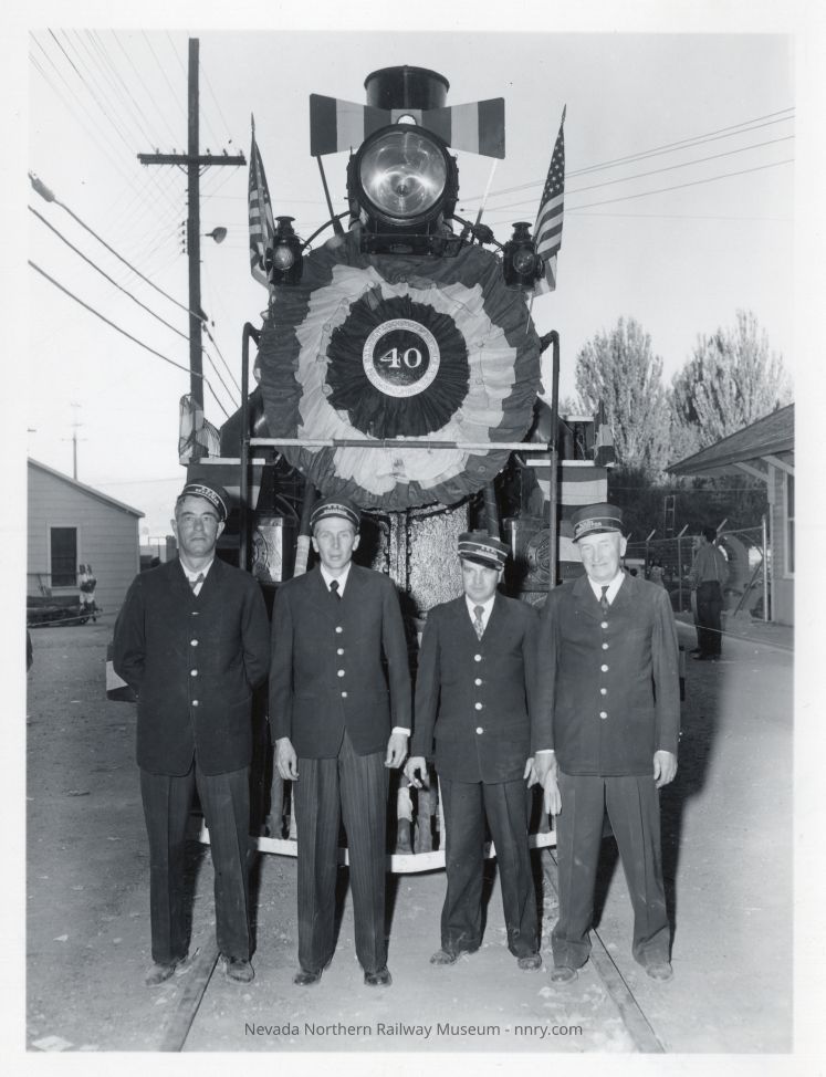 Passenger crew for the 50th Anniversary excursion train in front of locomotive #40 next to the Ely Depot, September 1956. Left to right, C.R. "Dick" Smith, Paul Tilly, Hap Jensen and Jack Perry.Photograph Details
