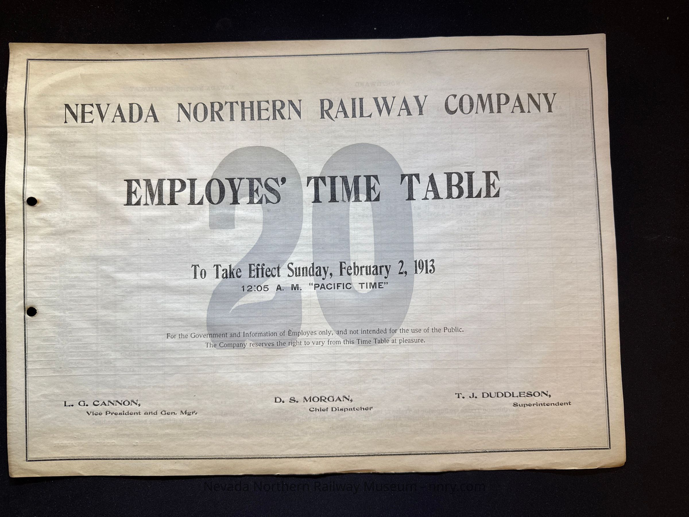 Nevada Northern Railway timetable no. 20, February 2, 1913.