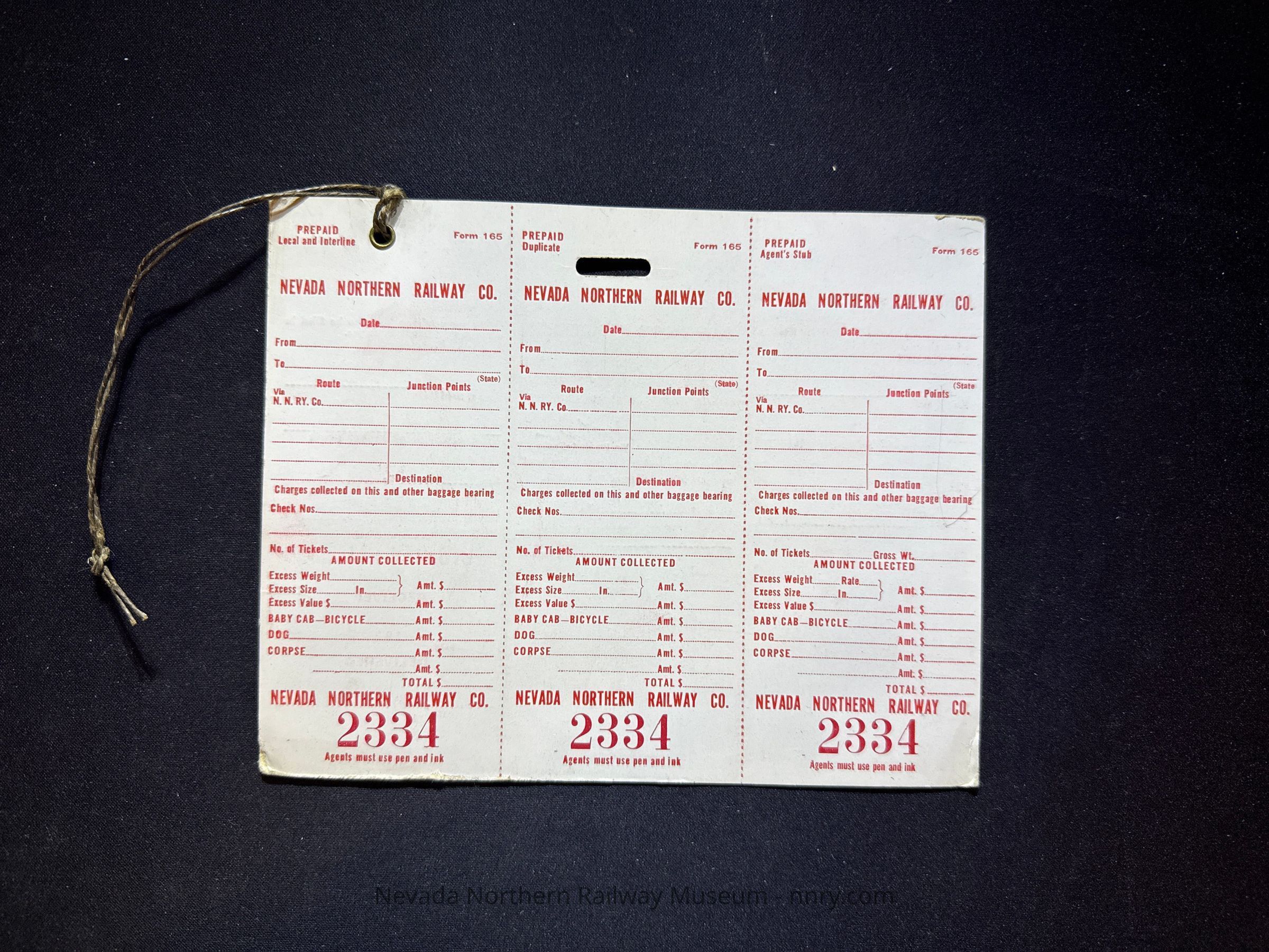 NNRy baggage tag with red print, form no. 165. Also used on baby cabs, bicycles, dogs and corpses.Category