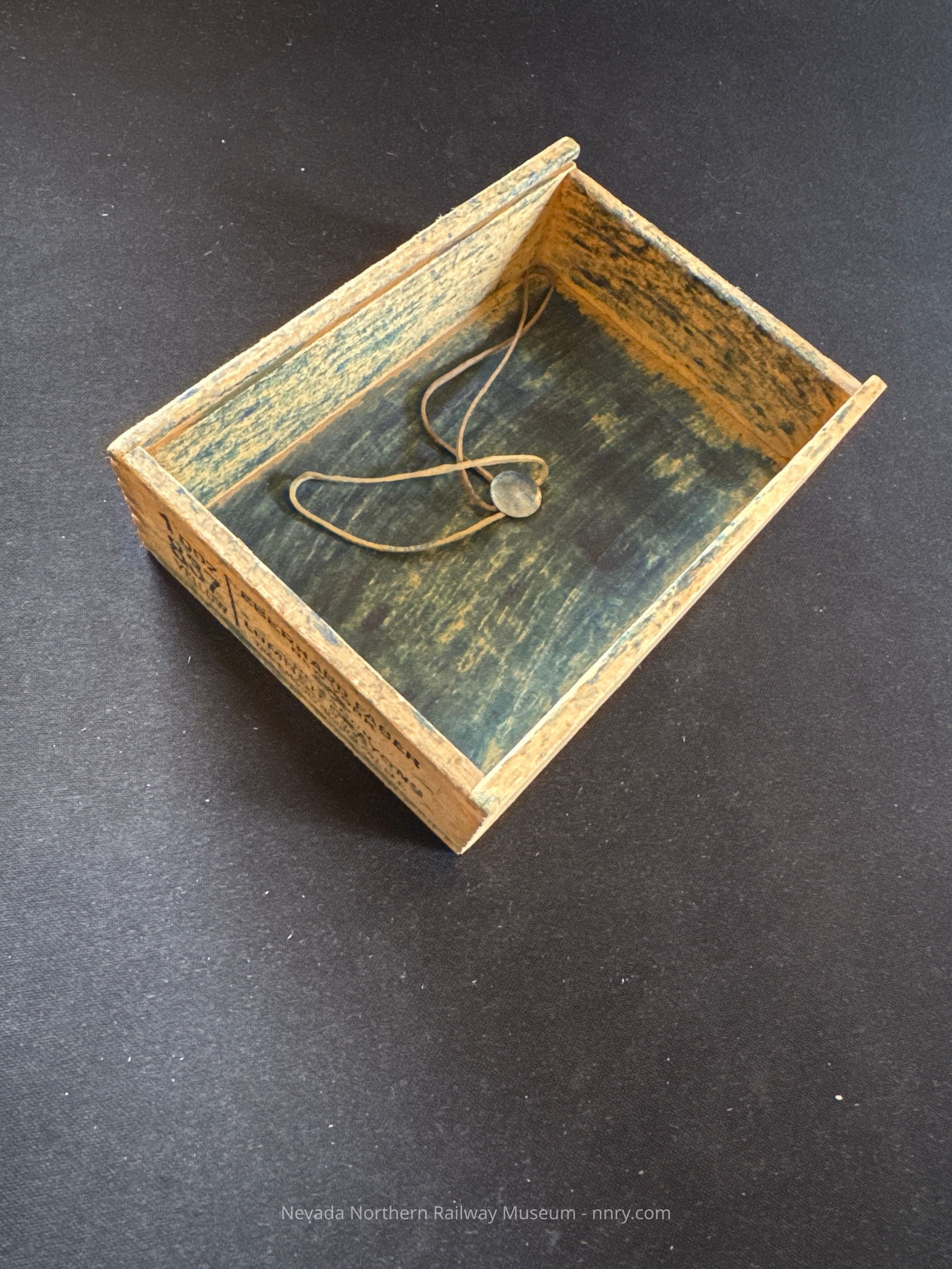 Wooden box, rubber bands thumbtacked into the interior center.