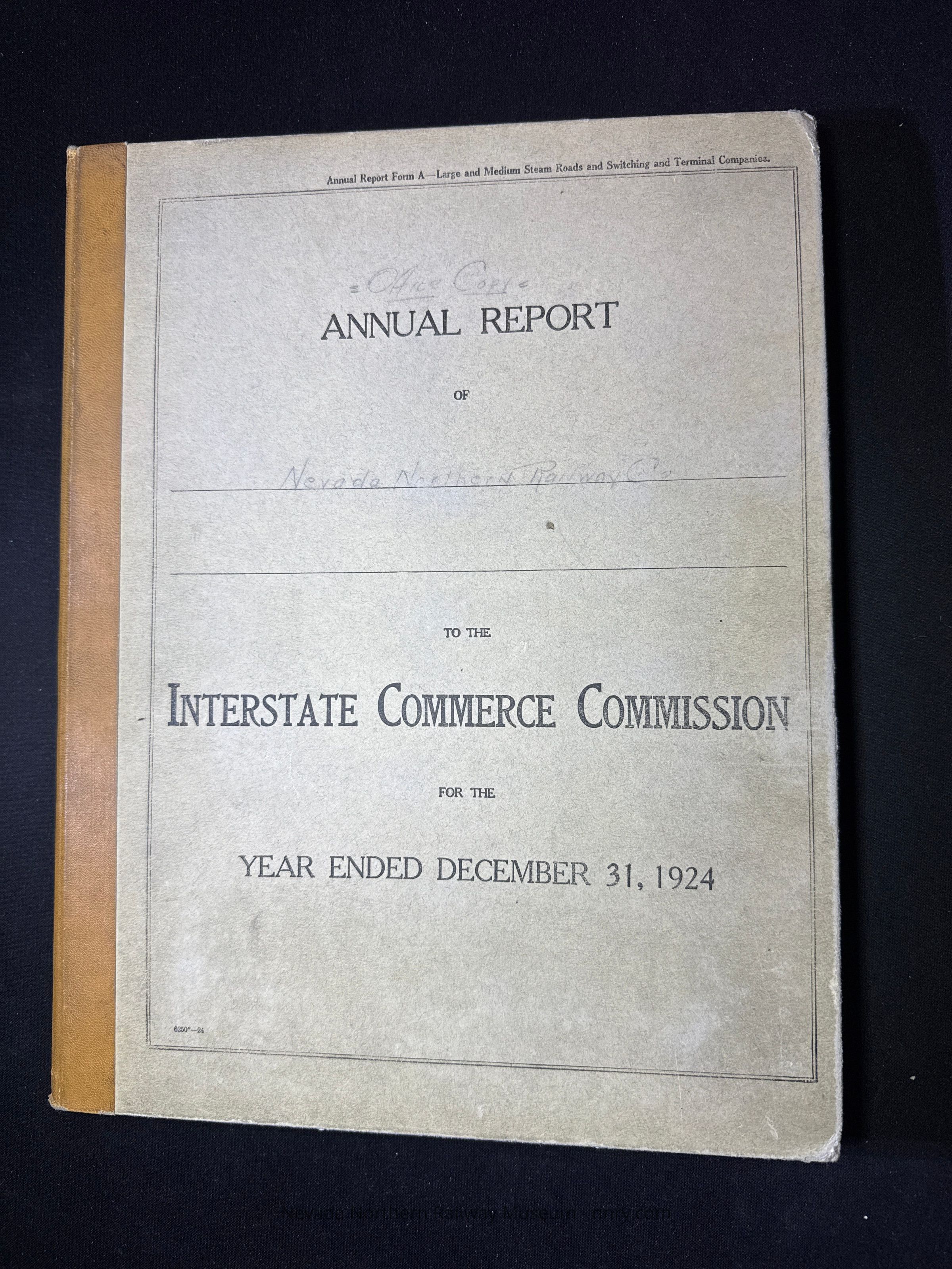 Annual report from the NNRy to the ICC for 1924, includes additional sheet of information between the pages, office file copy for the Auditor's office in East Ely.Creator