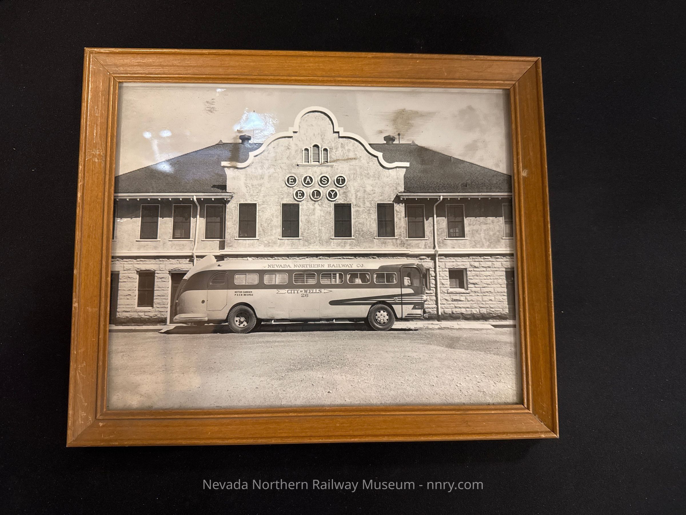 NNRy motor coach bus #26 "City of Wells" in front of the East Ely Depot, in a wooden frame, once hung in the general offices.Photograph Details