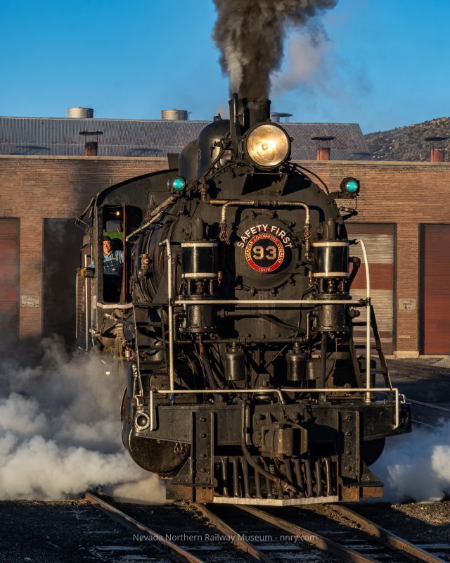 Locomotive #93 leaving the enginehouse, Engineer Ken Keels in the cab, February 2024.