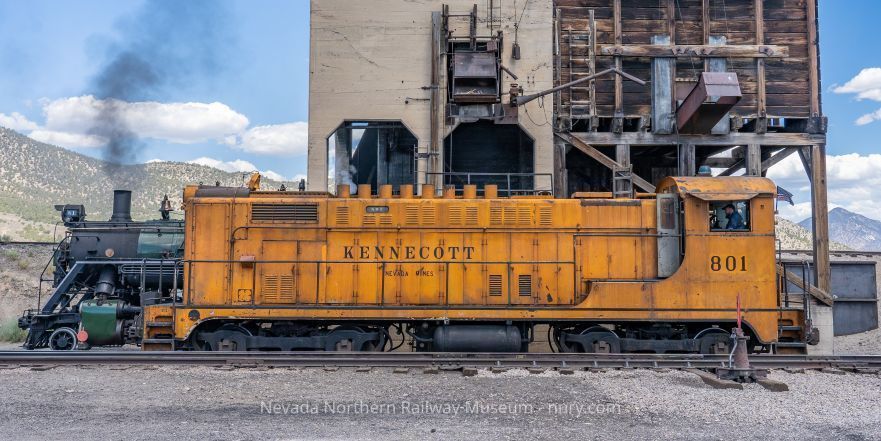 Locomotives #81 and #801 at the coaling tower, Master Mechanic John Henry McDonnell in the cab window of #801, July 1, 2022.